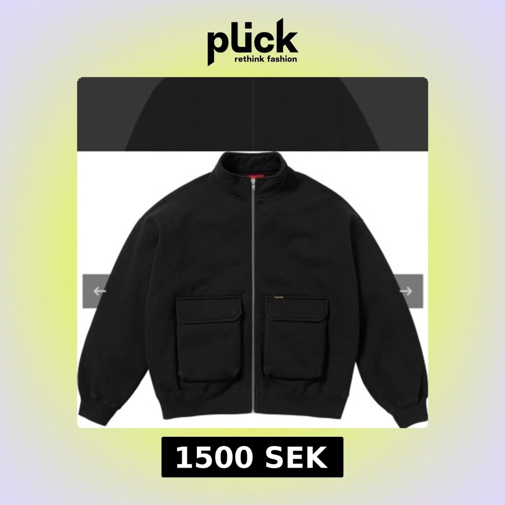 Supreme cargo pocket zip up sweatshirt i svart med två stora fickor framtill och hel YKK dragkedja. Jackan har hög krage och ribbade muddar. Tillverkad i bomull och har en clean streetwear-look med liten Supreme workwear logga på ena fickan. Skön och loose fit. Skicket är mycket bra. Man kan ha den som jacka också. Storlek L. Kvitto finns.