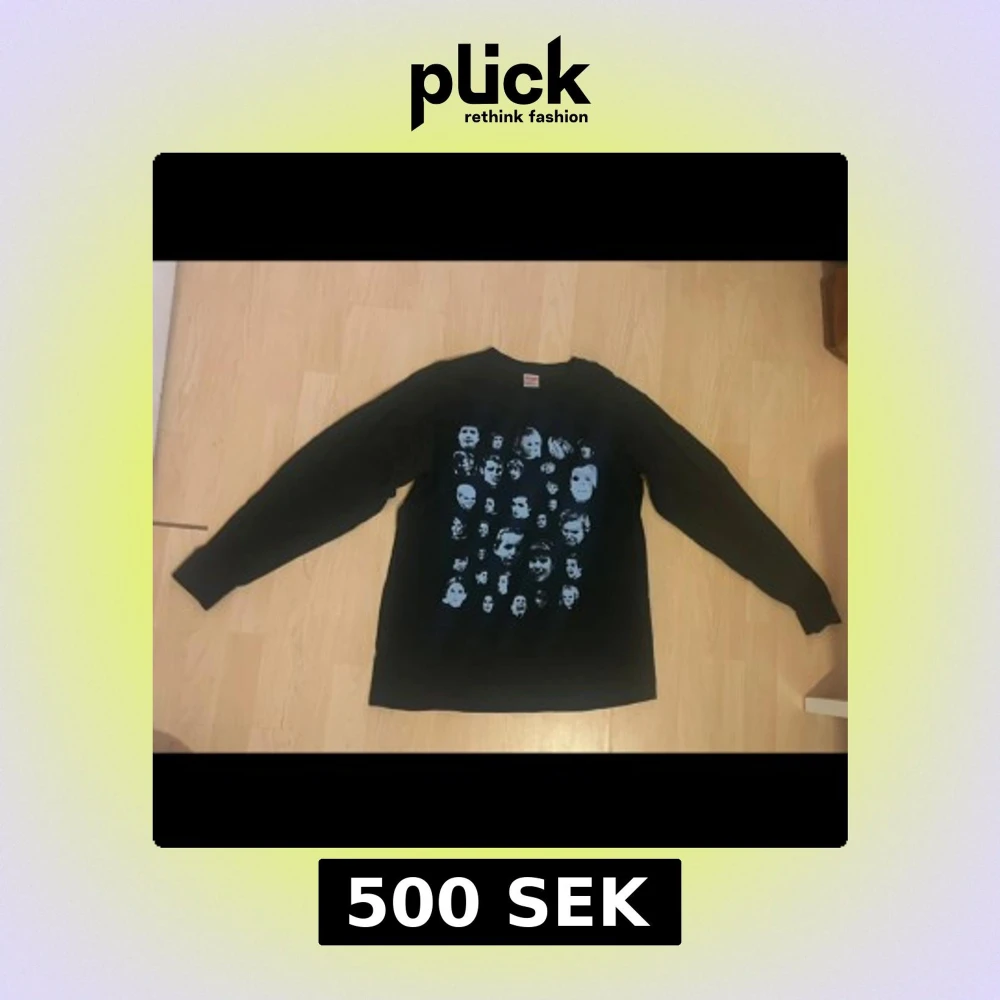 Cool svart långärmad tröja från Supreme i 100% bomull. Framsidan har ett tryck med flera olika ansikten i vitt och grått. Perfekt för dig som gillar streetwear och unika prints.