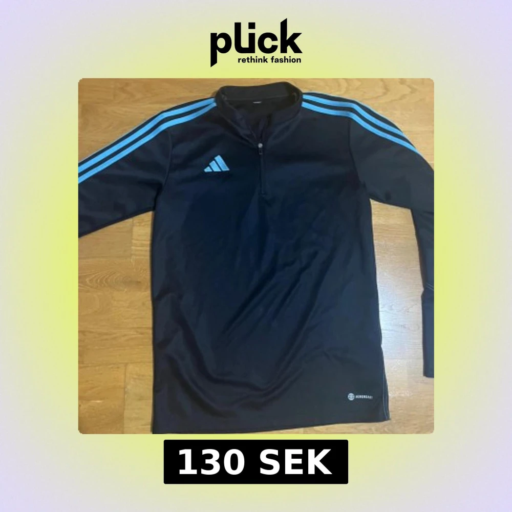 Svart långärmad tröja från Adidas med ljusblå ränder längs axlarna och half zip framtill. Tröjan har Aeroready-tryck nere vid höften och är gjord i ett mjukt syntetmaterial som passar perfekt till träning. Klassisk Adidas-logga på bröstet.