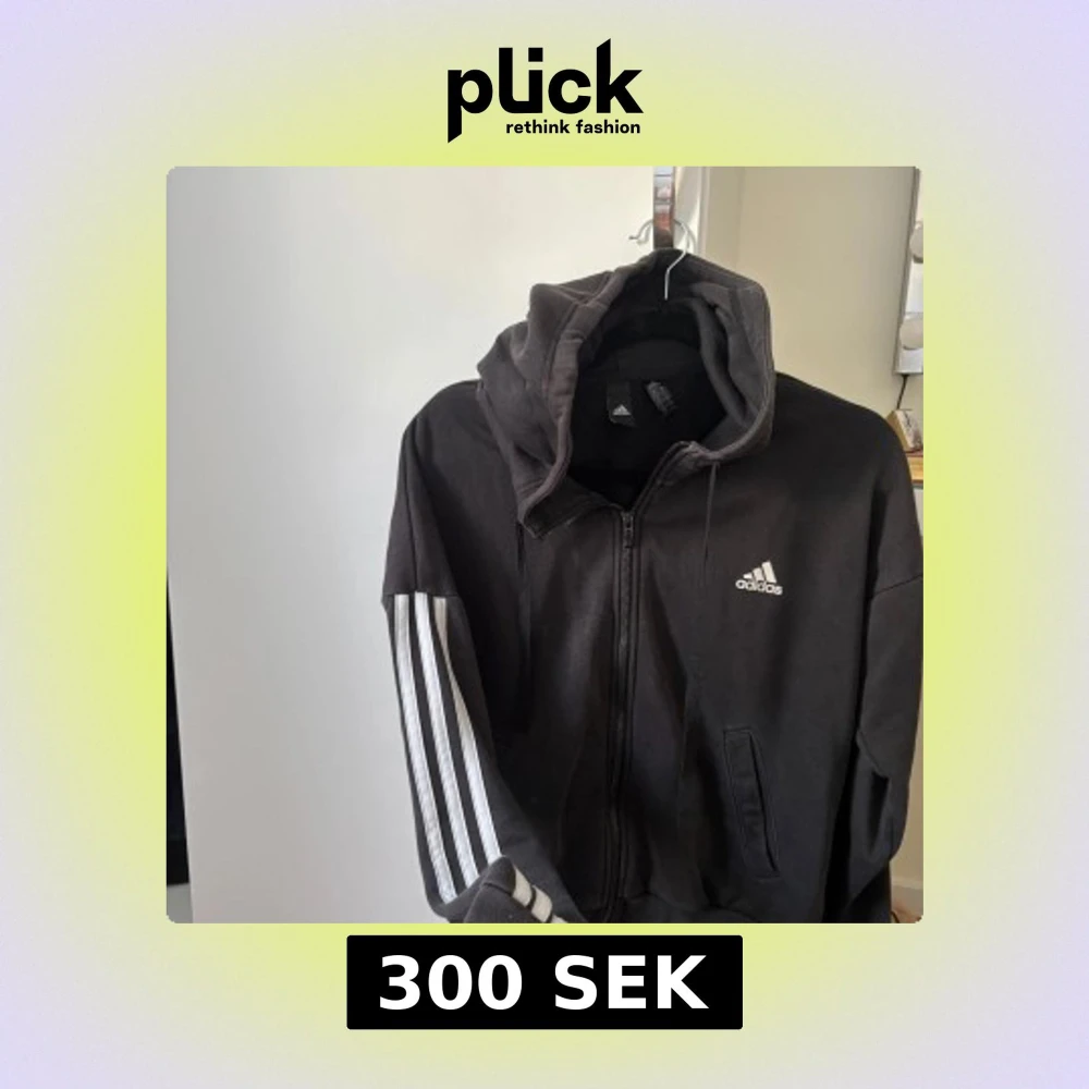 Svart hoodie från Adidas i storlek M med klassiska vita ränder längs ärmarna och Adidas-logga på bröstet. Tröjan har huva med snörning, dragkedja framtill och två fickor. Perfekt för en sportig och avslappnad stil.