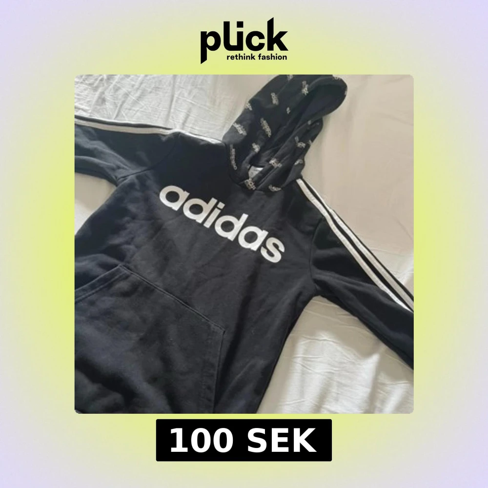 Svart hoodie från Adidas i storlek 152 med stor vit logga framtill och klassiska vita ränder längs ärmarna. Huva med Adidas-tryck och stor magficka. Perfekt för en sportig och avslappnad stil.