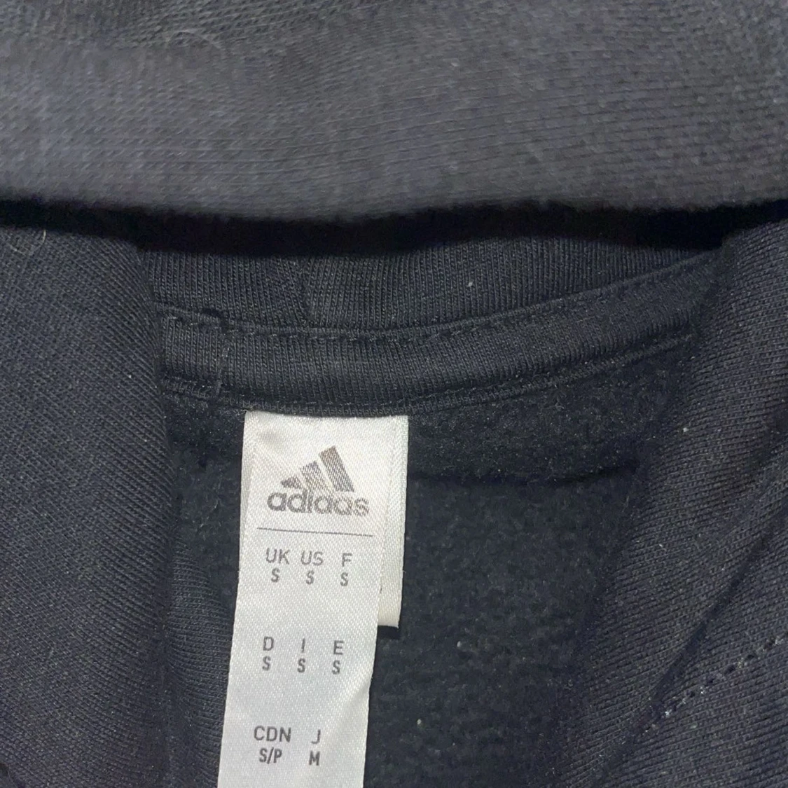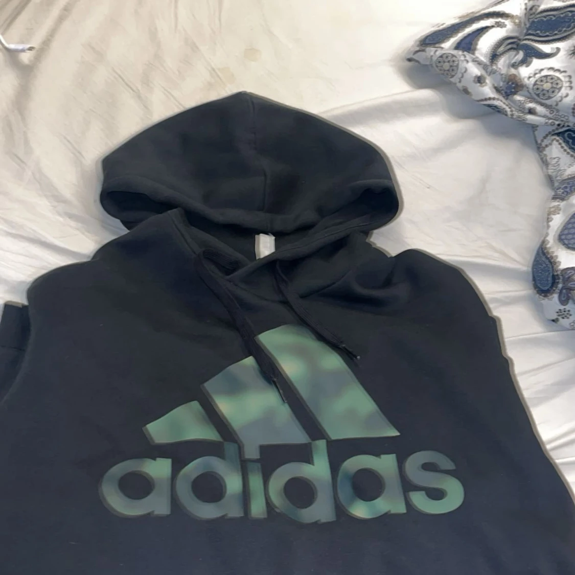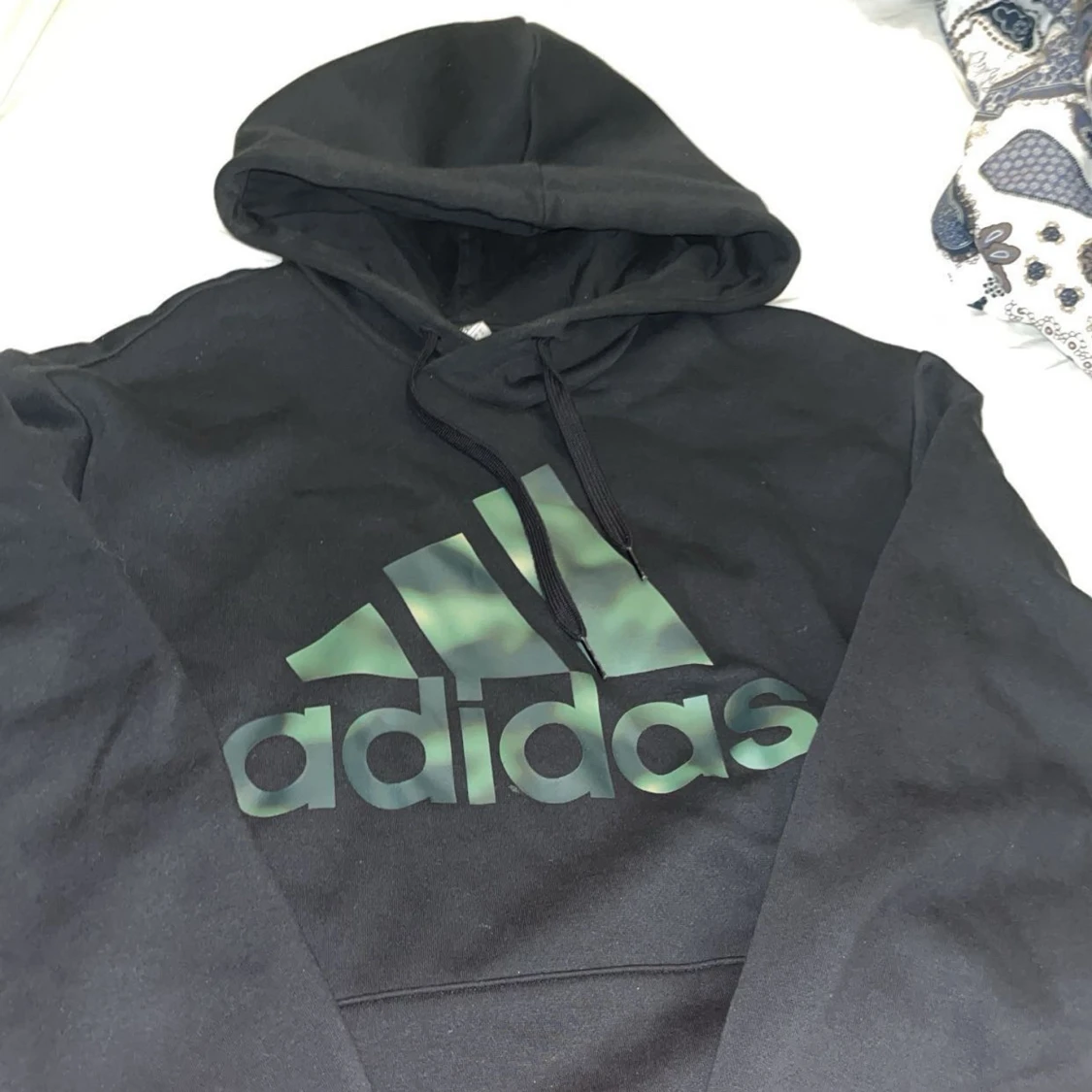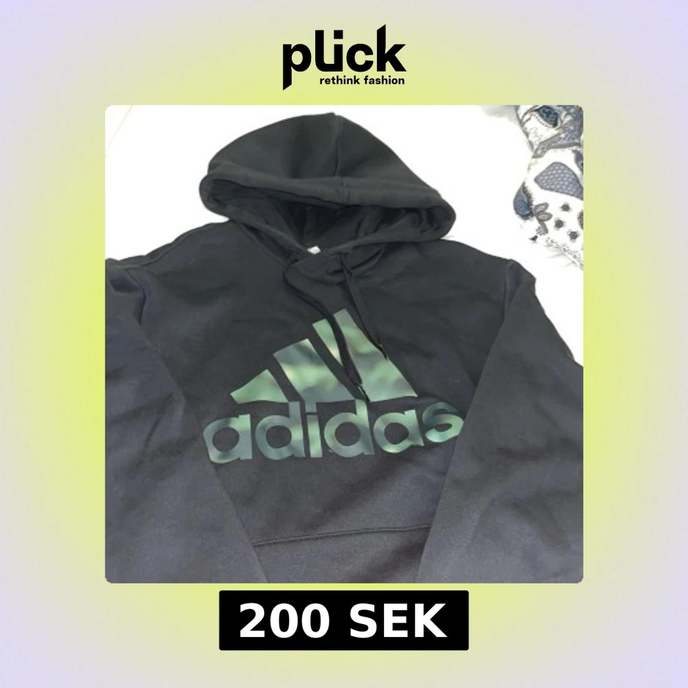 Svart hoodie från Adidas med stor logga i grönt och svart framtill. Klassisk huva med snörning och mjukt material som känns skönt mot huden. Perfekt för dig som gillar sportig och avslappnad stil. S men passar även M