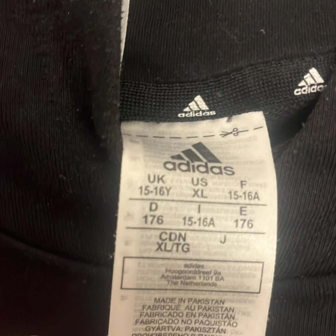 Svart hoodie från Adidas i storlek med stor vit Adidas-logga på bröstet. Klassisk huva och magficka framtill, tillverkad i mjuk bomull och polyesterblandning. Perfekt för dig som gillar sportig och chill stil.