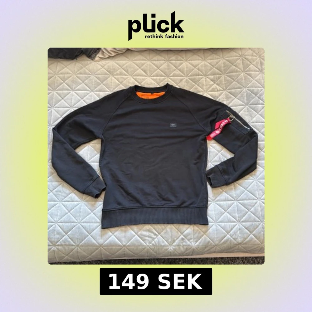 Svart sweatshirt från Alpha Industries med klassisk rund hals och orange insida. På vänster ärm finns en dragkedja och den ikoniska röda 'Remove Before Flight'-taggen. Tröjan har ribbade muddar och en liten logotyp på bröstet. Perfekt för en stilren streetlook.