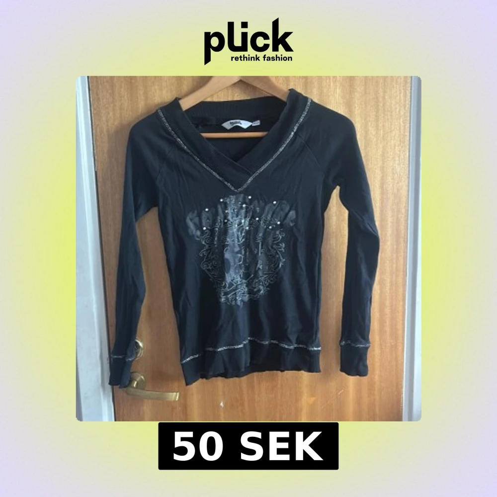 Svart långärmad tröja från Heart Quality med v-ringad ribbad krage och coolt tryck framtill med silvriga detaljer och små paljetter💗Är igentligen en barntröja men skulle säga att den passar XS