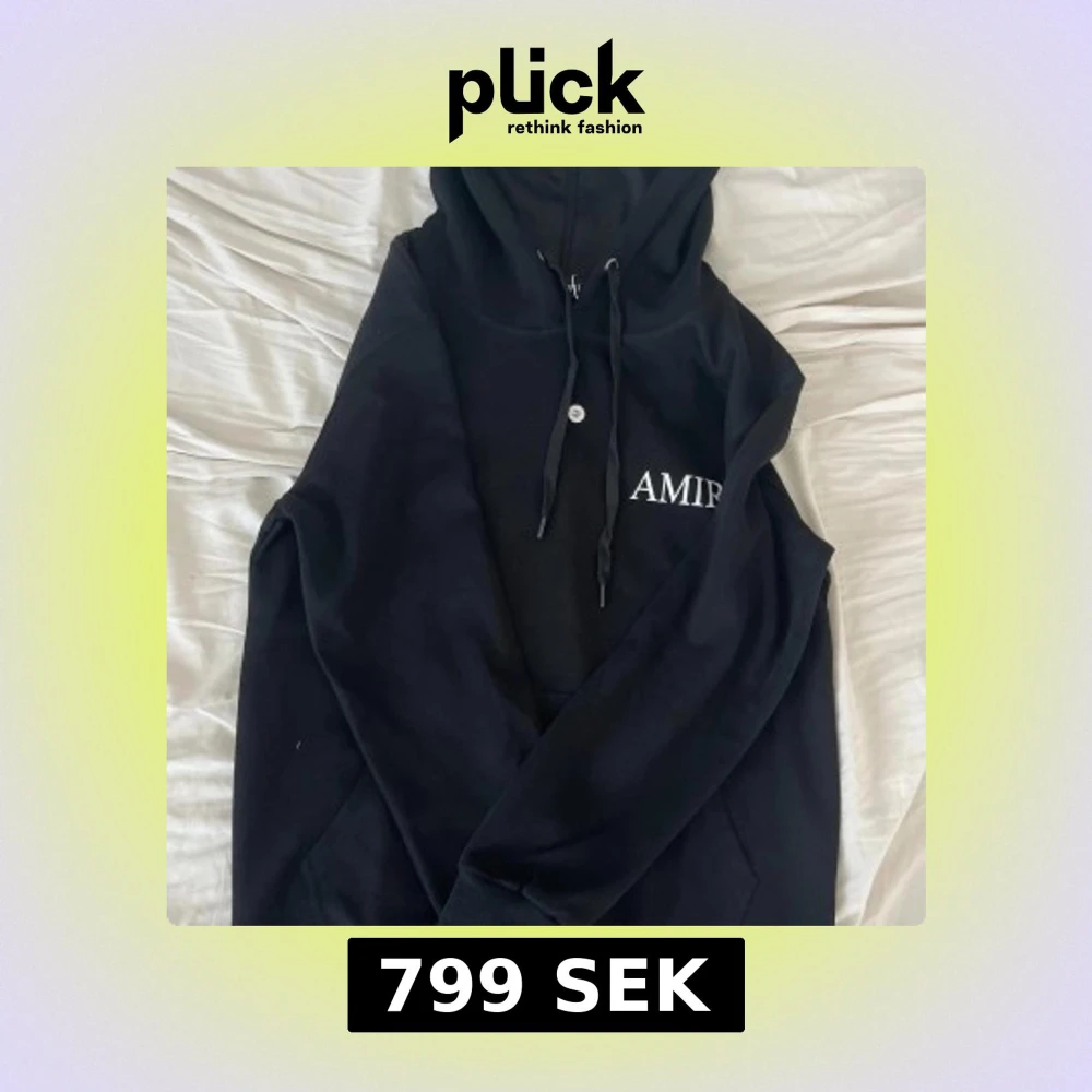 Svart hoodie från AMIRI med vit logga på bröstet och stor botanisk illustration av cannabisväxt på ryggen. Tröjan har huva med snörning, känguruficka och långa ärmar. Materialet känns mjukt och skönt, perfekt för dig som gillar streetwear med unik design.