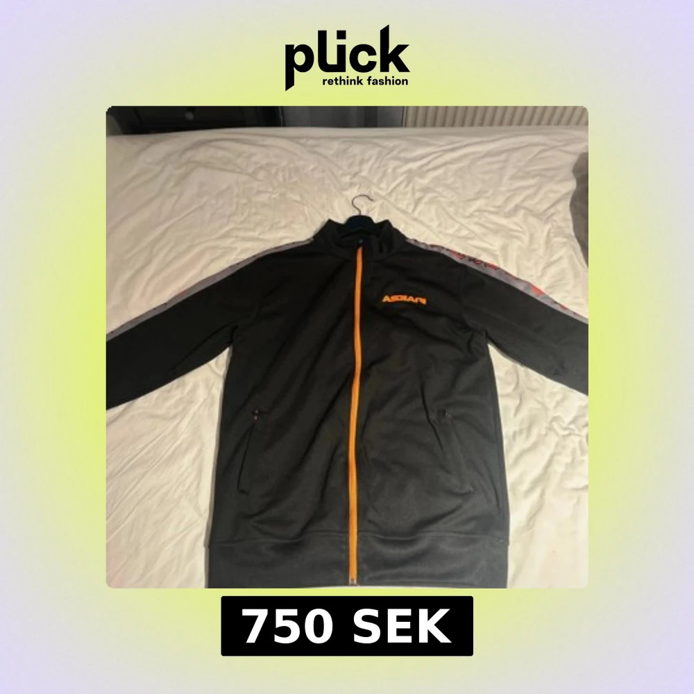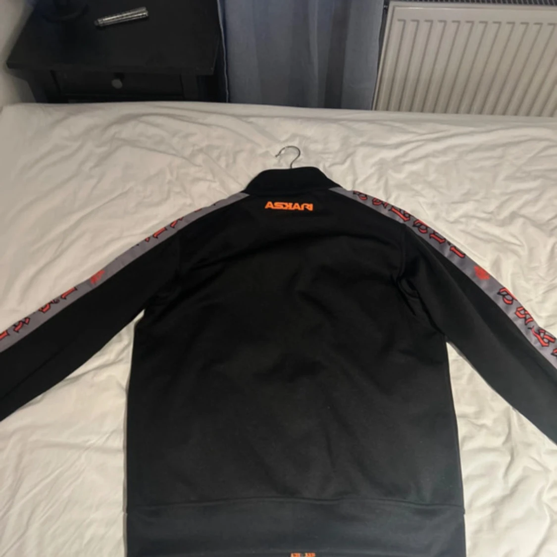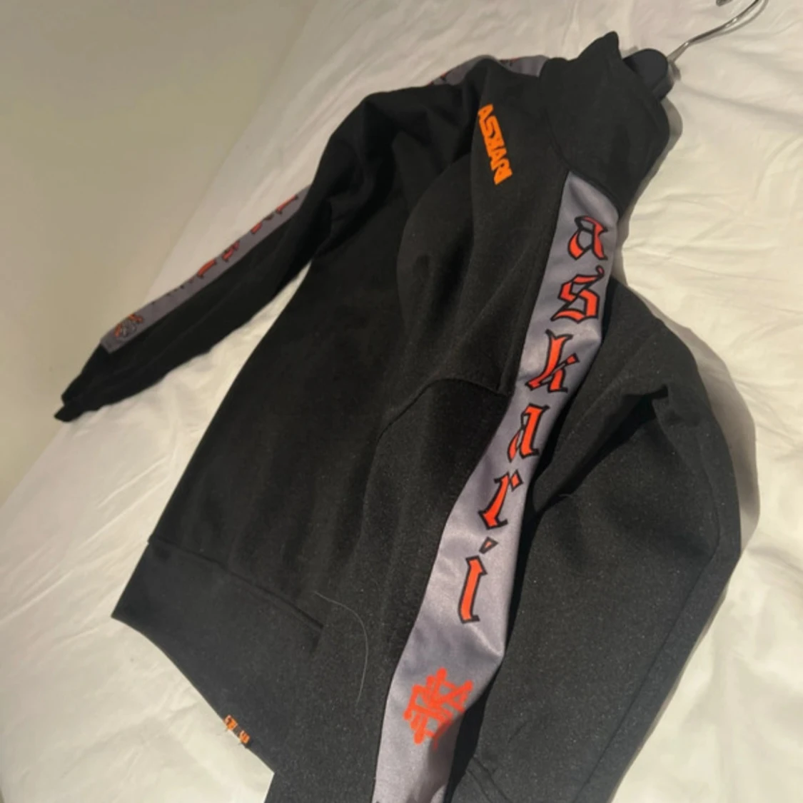 Svart ziptröja från Askari med orange logga på bröstet och ryggen. Snygga grå ränder med text längs ärmarna och orange dragkedja framtill. Tillverkad i 100% polyester och har två fickor med dragkedja. Perfekt för dig som gillar sportig stil.