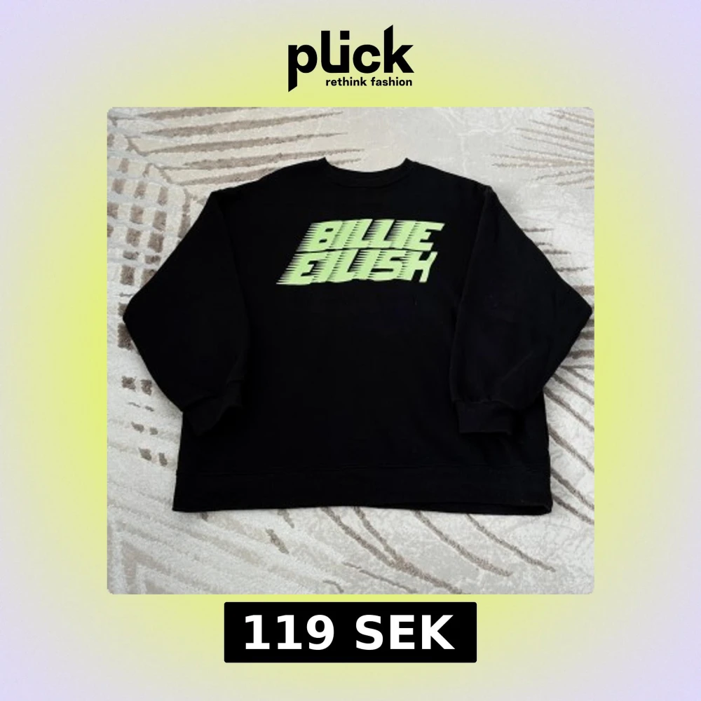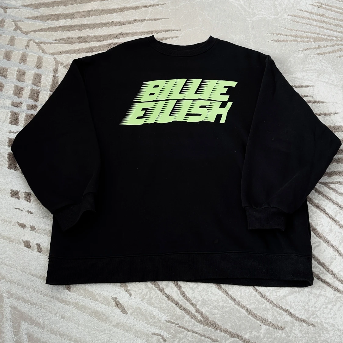Svart tröja med neongrönt tryck "BILLIE EILISH" på framsidan. Officiell merch från H&M-kollektionen. Oversized modell i storlek S – passar även M beroende på önskad passform. Material: 60% bomull, 40% polyester – mjuk, varm och perfekt för höst/vinter. Använt skick, få fläckar (se bilderna för detaljer), inget som dock stör helhetsintrycket.