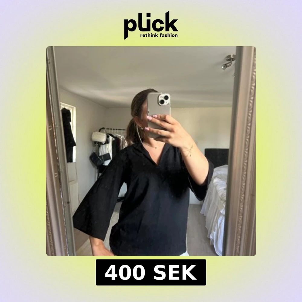 Säljer en svart blus från My Essential Wardrobe i storlek S. Blusen har v-ringning och trekvartsärmar, perfekt för en stilren och enkel look. Passar till många olika outfits och är lätt att matcha.
