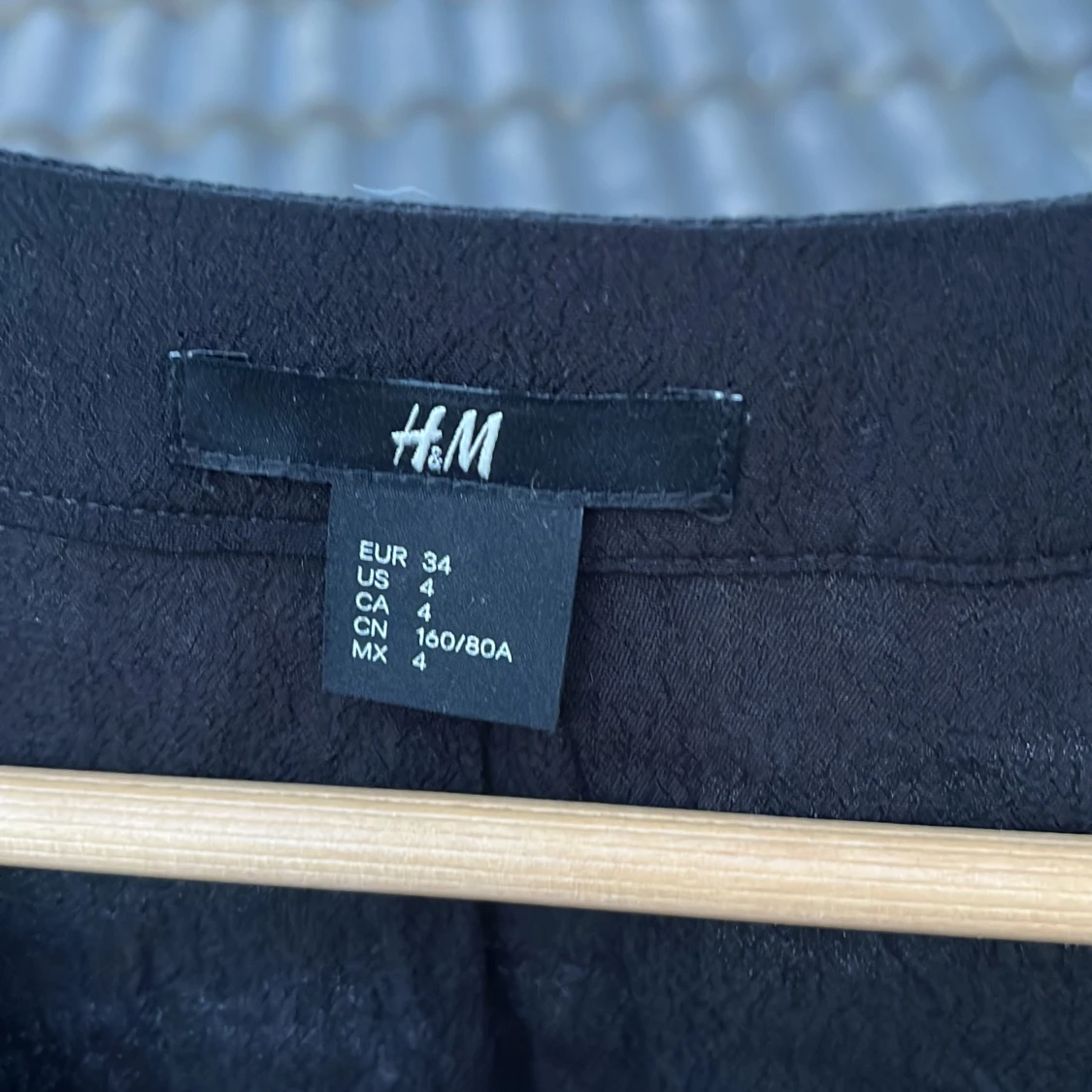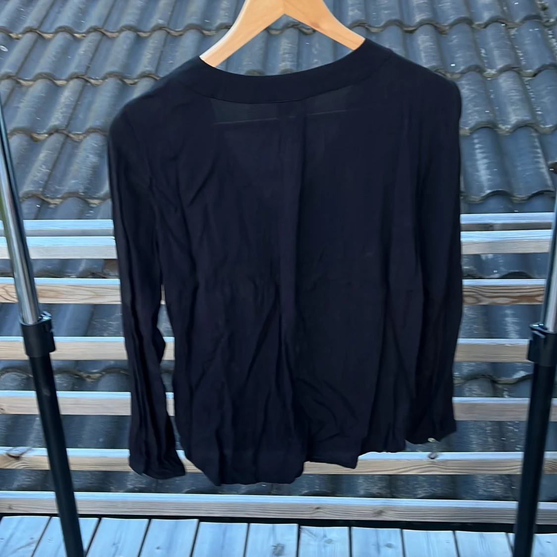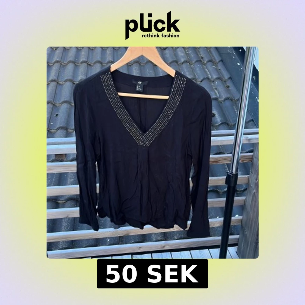 Svart blus från H&M i storlek 34 med lång ärm och snygg v-ringning dekorerad med små silvriga nitar. Blusen har en lös passform och är tillverkad i ett lätt, mjukt tyg som ger en skön känsla. Perfekt för dig som gillar stilrena detaljer.