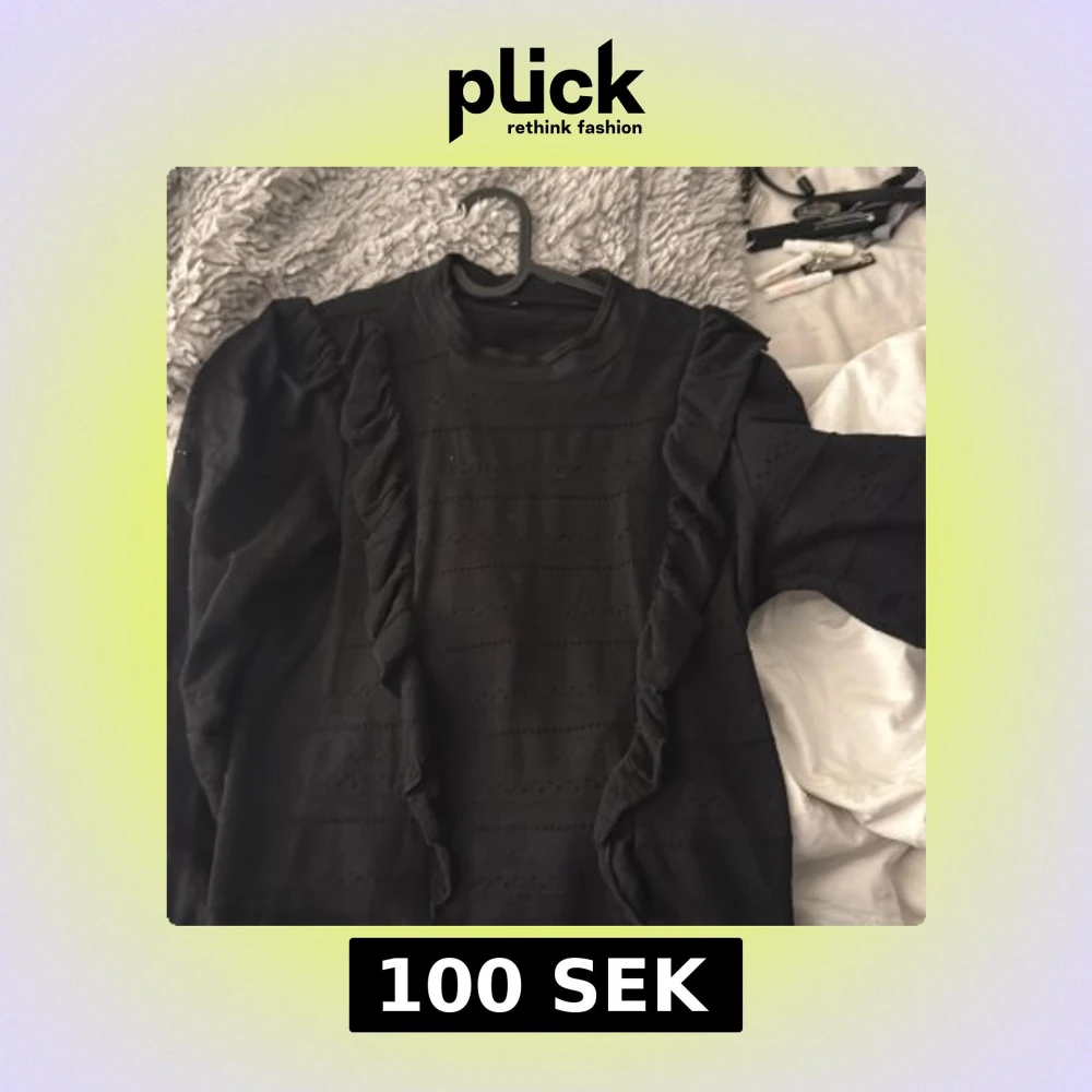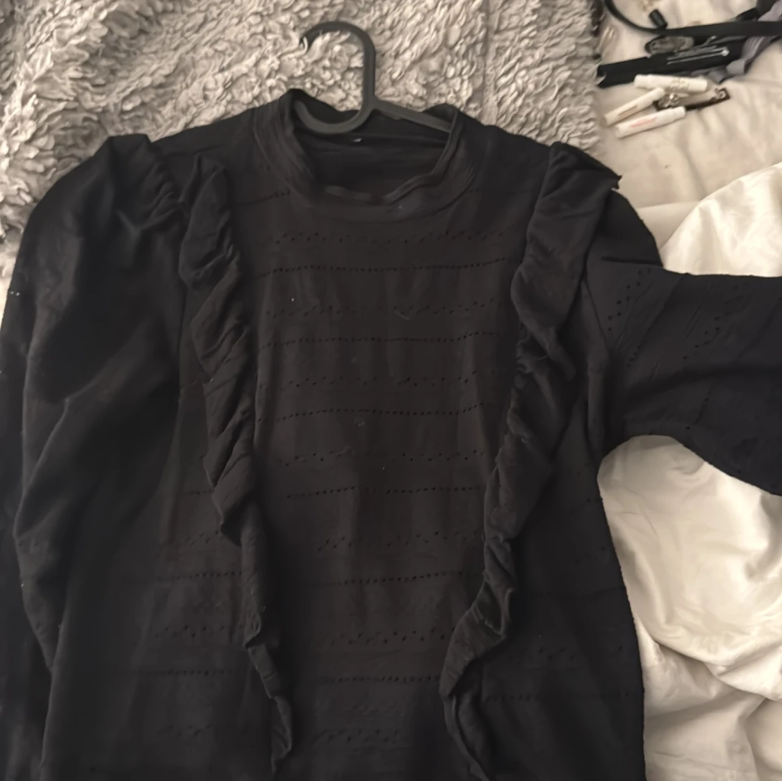 Säljer en svart blus med långa ärmar och snygga volangdetaljer längs framsidan. Blusen har ett diskret hålmönster och rund halsringning, perfekt för dig som gillar stilrena plagg med en twist.