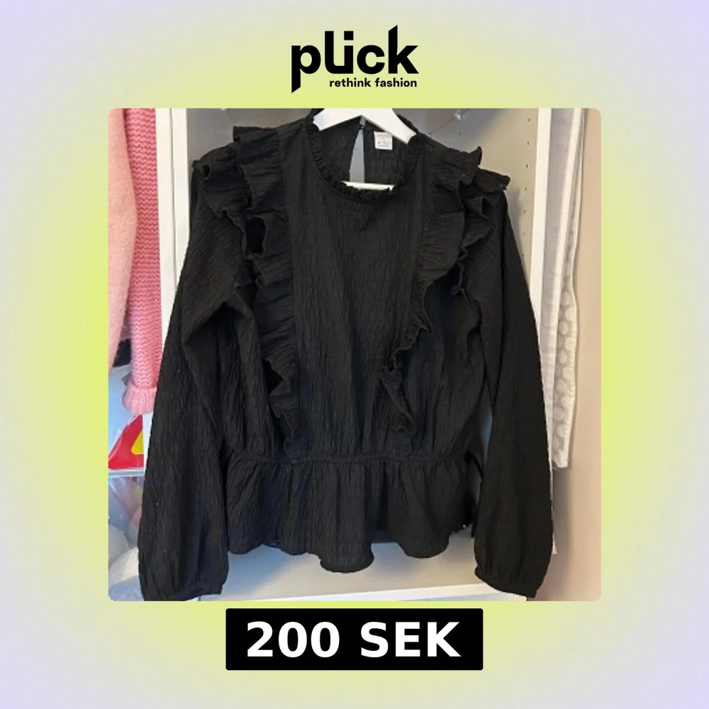 Säljer en svart blus från Lindex med långärmade ärmar och snygga volangdetaljer längs axlar och framstycke. Blusen har en lätt skrynklig struktur och rund halsring. Aldrig använd men stor i storleken så skulle säga att den mer passar xs-s