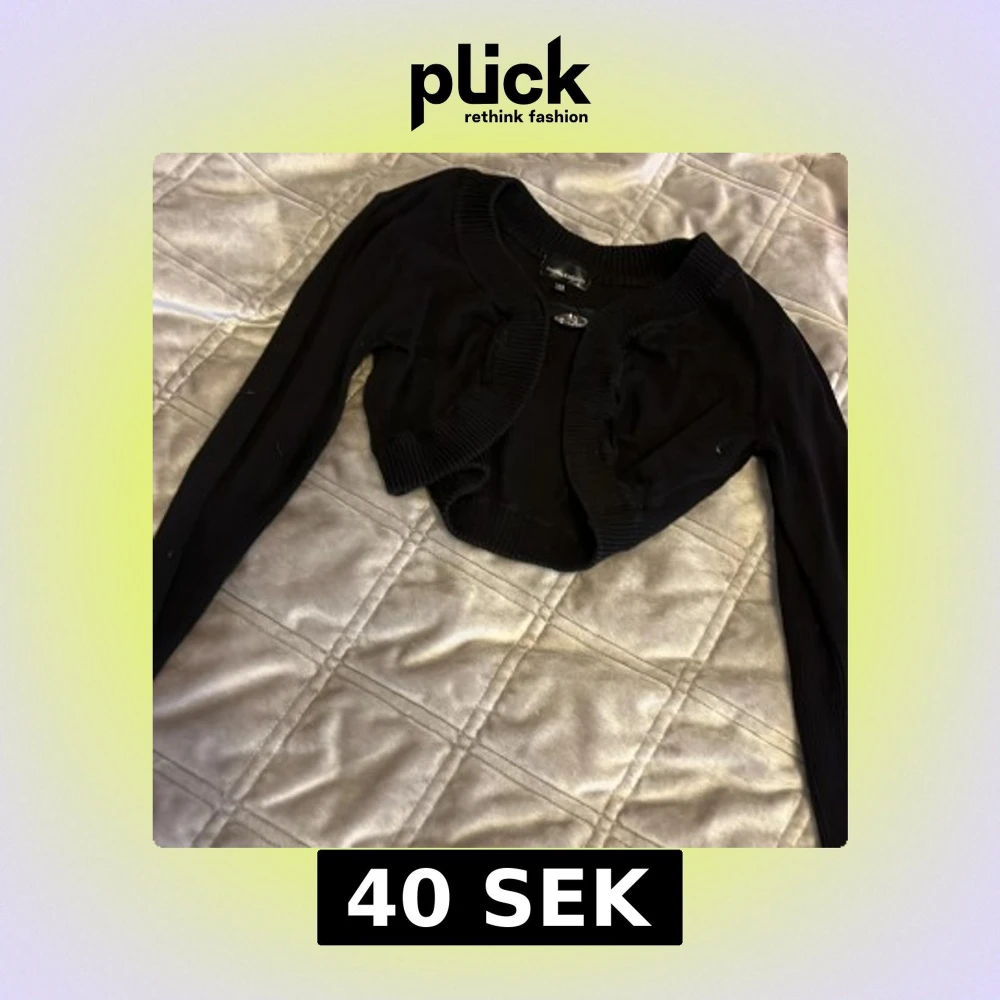 Säljer en stilren svart bolerotopp från KappAhl. Toppen har långa ärmar och en söt hjärtformad knapp framtill. Perfekt för att lägga till en extra touch till din outfit. Passar bra till både vardag och speciella tillfällen.