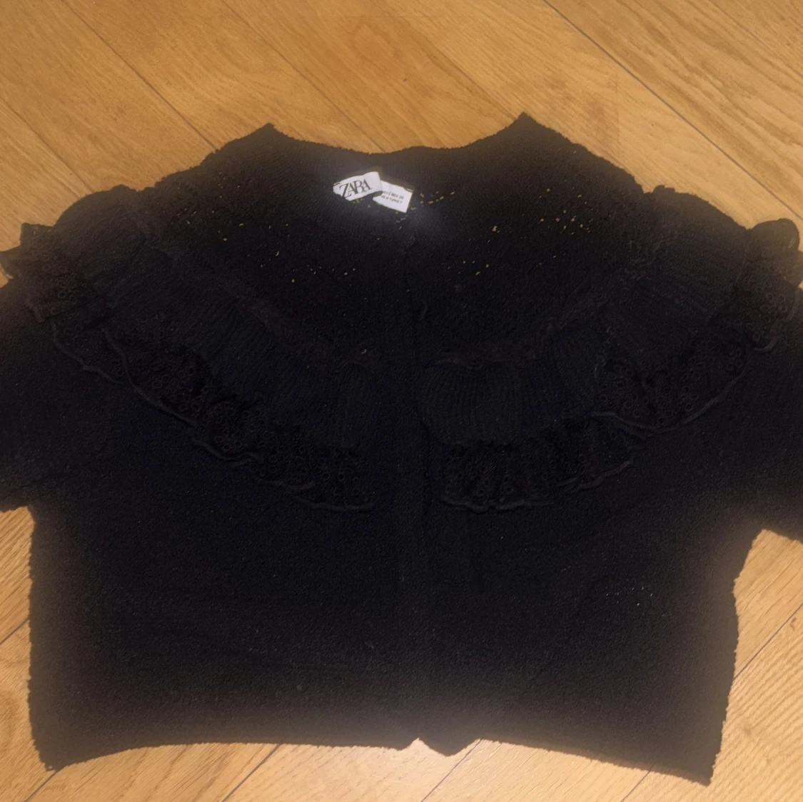 Säljer en sött svart bolerotopp från Zara med volangdetaljer. Perfekt för att lägga till en touch av stil till din outfit. Toppen är kortärmad och har en fin struktur som ger en unik look. Använd endast 1 gång så är i utmärkt skick .