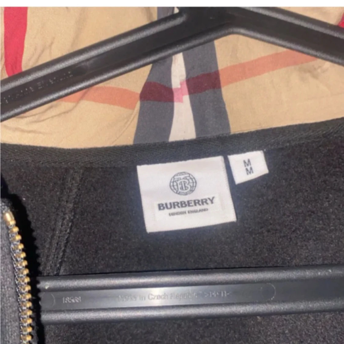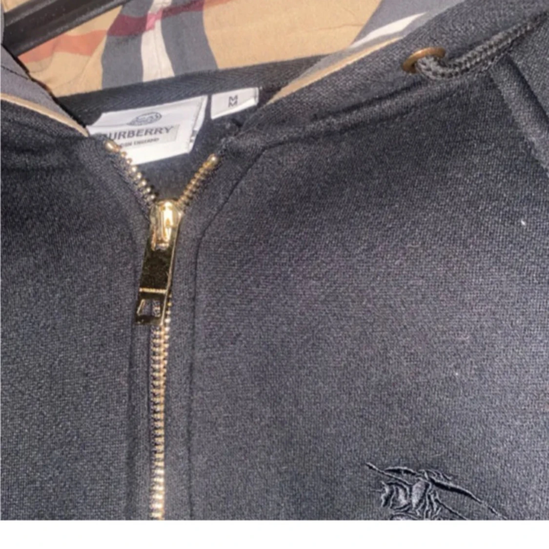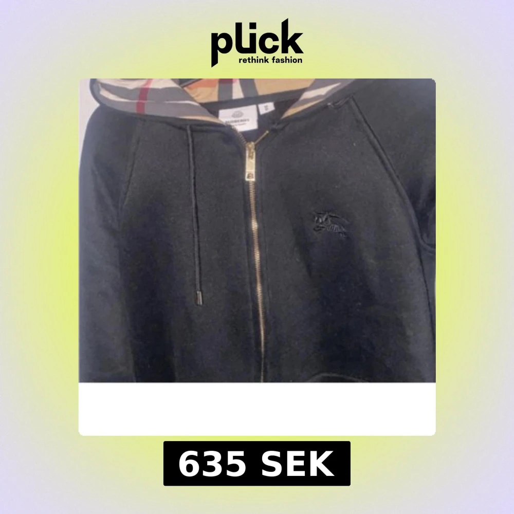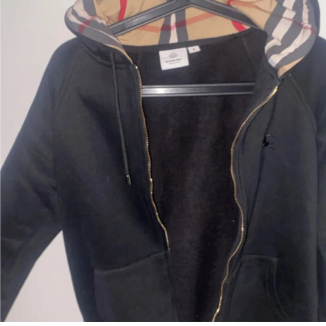 Svart hoodie från Burberry i storlek M med klassisk rutmönstrad huva, guldfärgad dragkedja och broderad logga på bröstet. Tröjan har snörning vid huvan och är tillverkad i mjuk bomull. Perfekt för dig som gillar stilrena designer med lyxig touch.