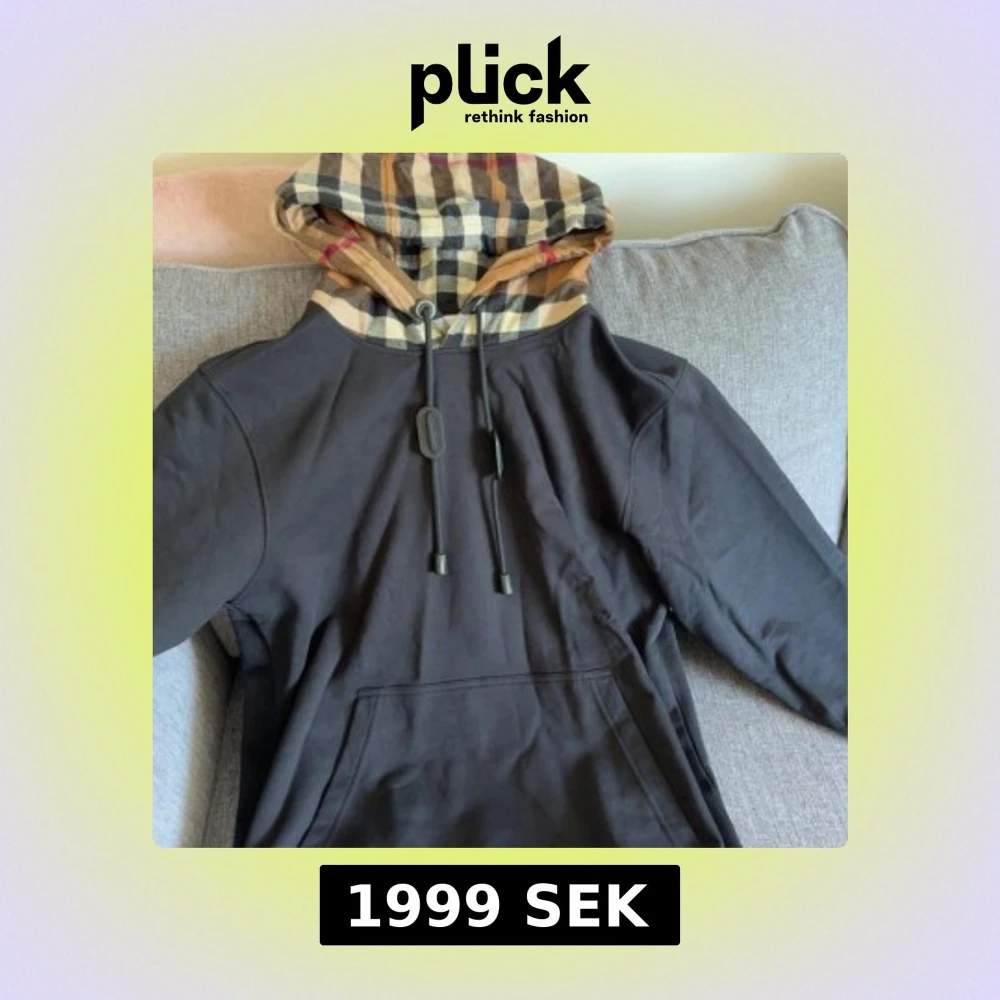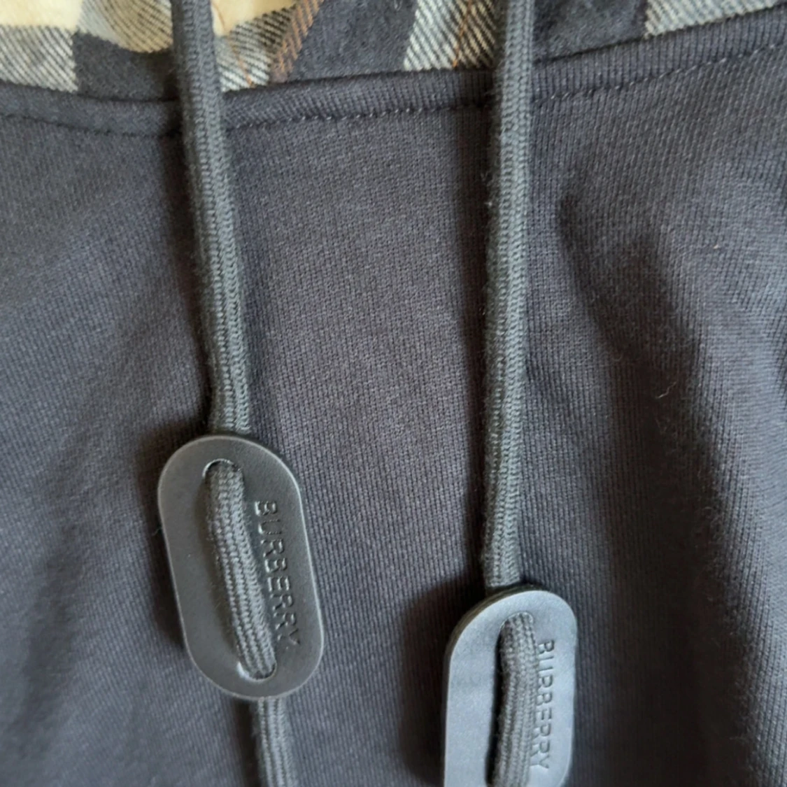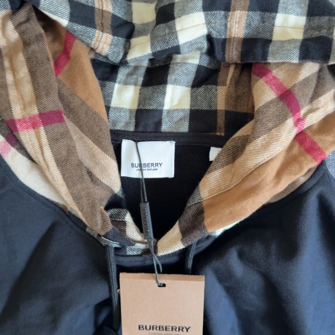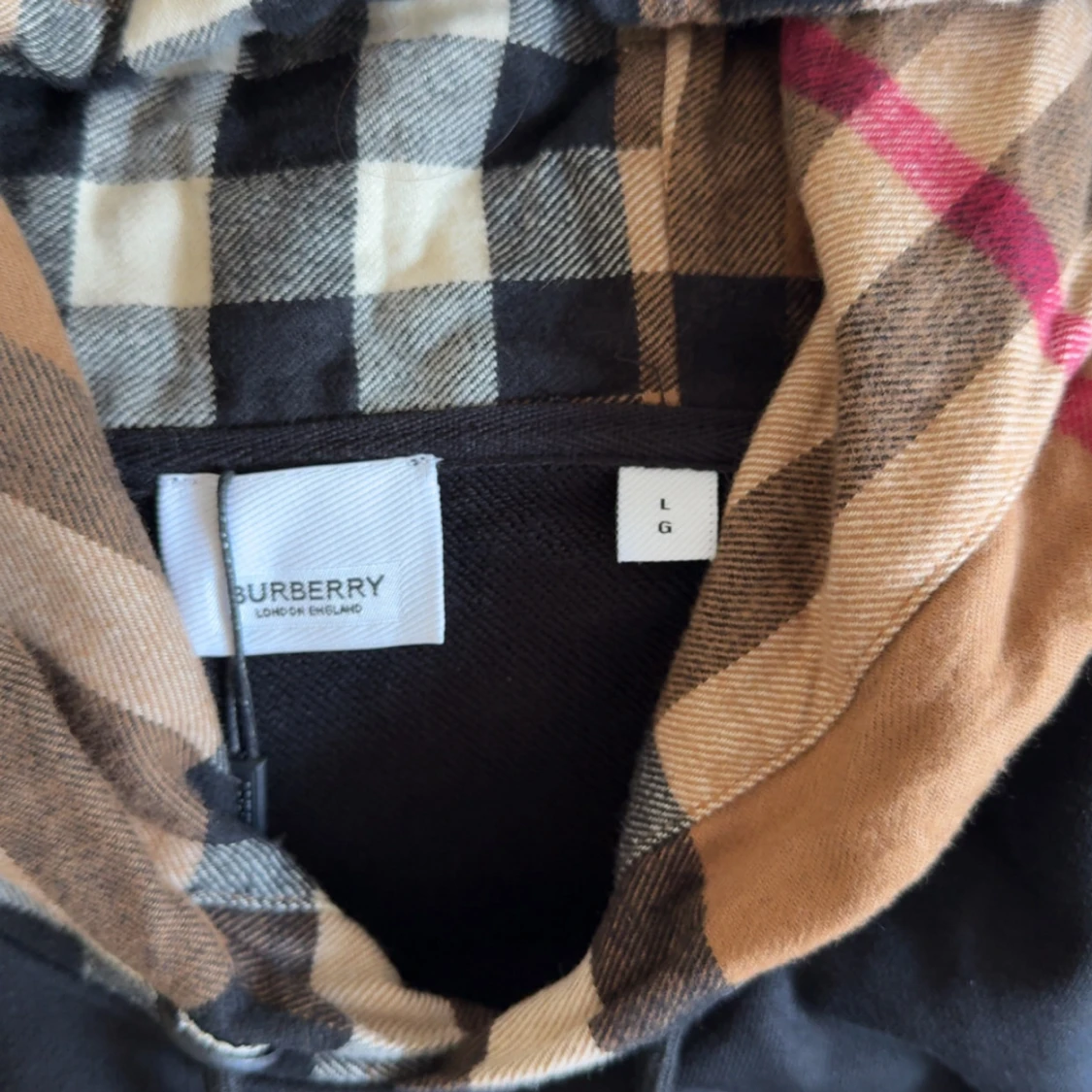 Säljer en svart hoodie från Burberry i storlek L. Den har en klassisk rutig huva i beige, svart, vit och röd, samt snörning med Burberry-logga. Tröjan har en stor magficka och är tillverkad i mjuk bomull. Perfekt för dig som gillar stilrena streetwear-plagg med lyxig touch.