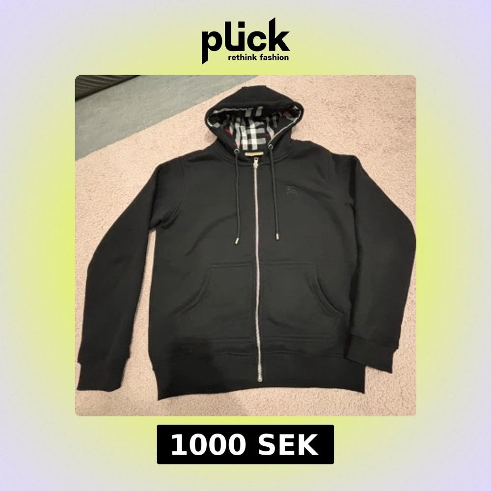 Svart Burberry med hel dragkedja, snörning i huvan och klassiskt rutigt foder på insidan. Tröjan har två stora fickor framtill och diskret broderad logga på bröstet. Perfekt för dig som gillar stilrena och exklusiva plagg.