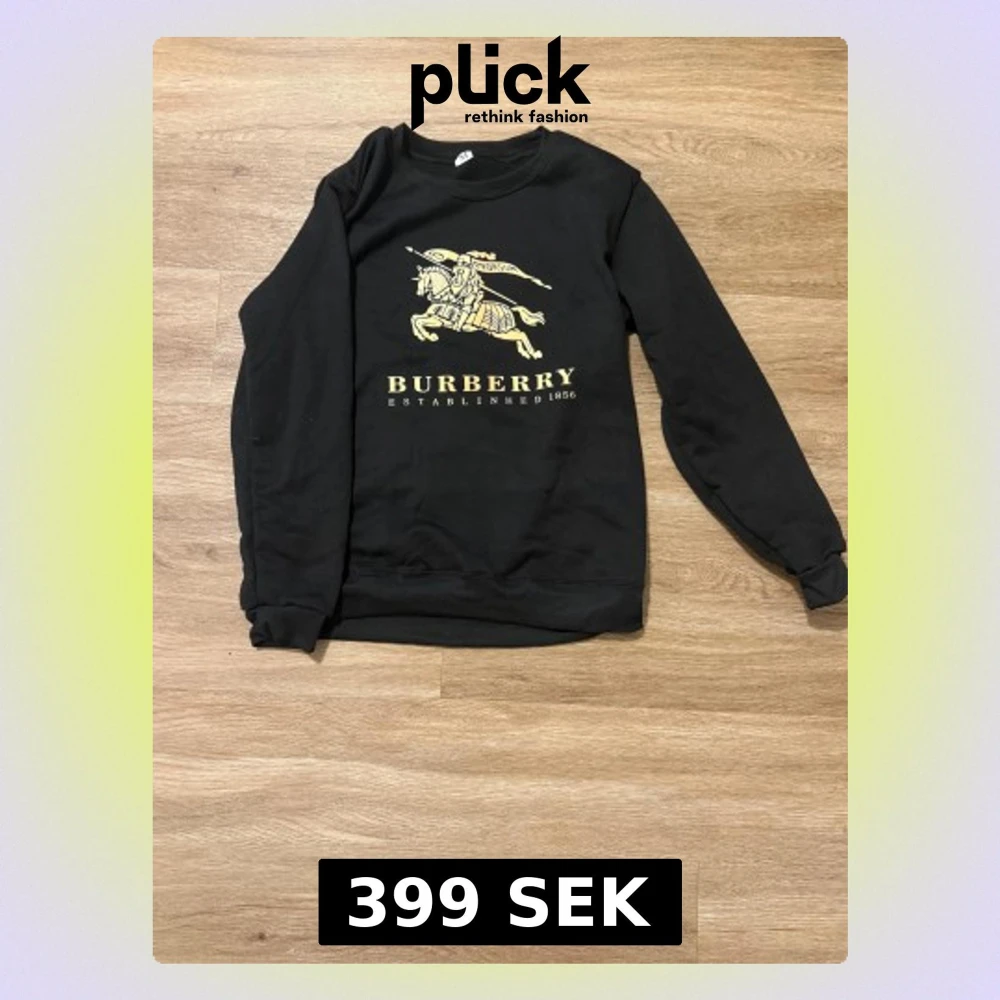 Svart sweatshirt från Burberry med stort guldtryck på bröstet som visar en riddare och texten 'Burberry Established 1856'. Tröjan har rund hals, långa ärmar och mjukt material som känns skönt mot huden. Perfekt för dig som gillar klassisk streetstyle.