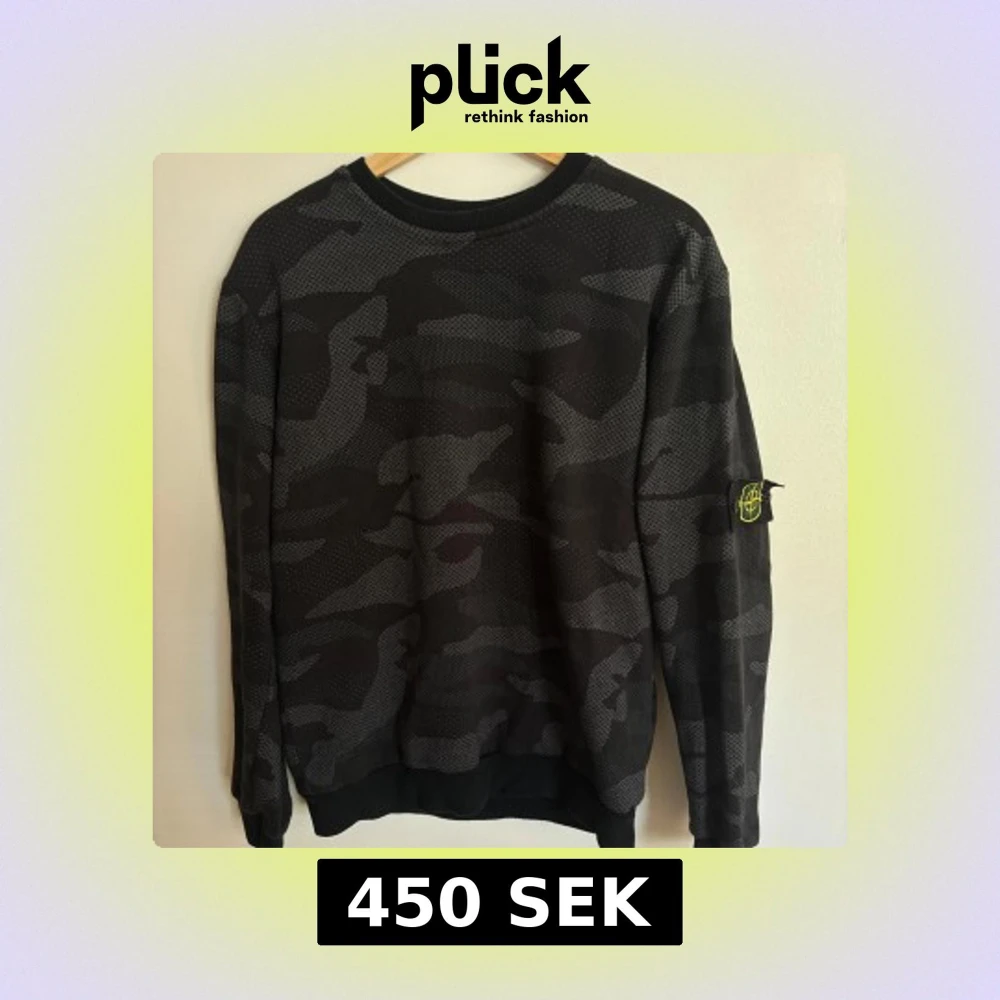 Säljer en svart och grå camouflagemönstrad sweatshirt från Stone Island med klassisk logotyp-patch på vänster ärm. Tröjan har rund halsringning och ribbade muddar vid ärmslut och nederkant. Perfekt för en streetwear-look.