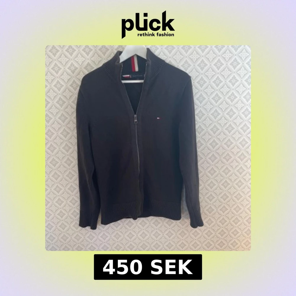 Säljer en stilren svart kofta från Tommy Hilfiger med dragkedja och ribbade detaljer. Den har en liten logotyp på bröstet och röd-vit randig detalj vid kragen. Perfekt för en klassisk look.