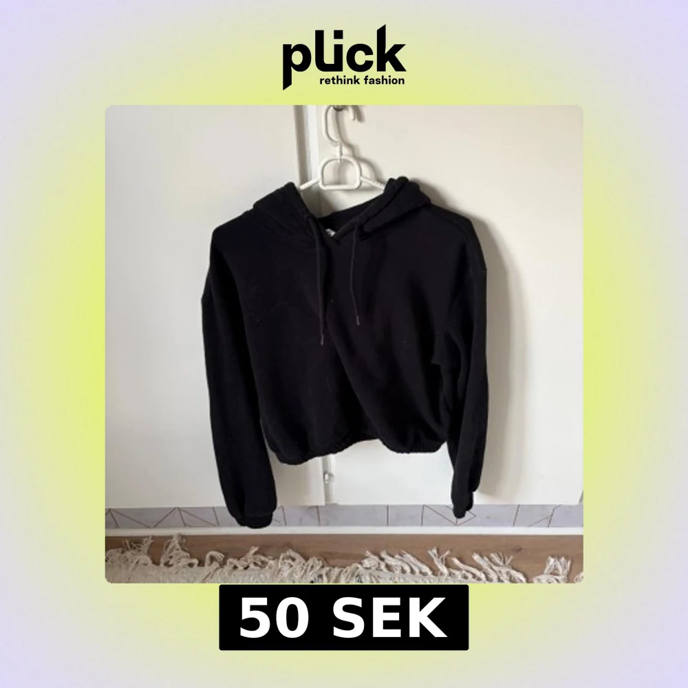 Svart croppad hoodie från H&M Divided med huva och snörning. Tröjan har långa ärmar och är tillverkad i mjuk bomull, perfekt för en chill och avslappnad stil. Enkel och stilren design som funkar till många outfits.