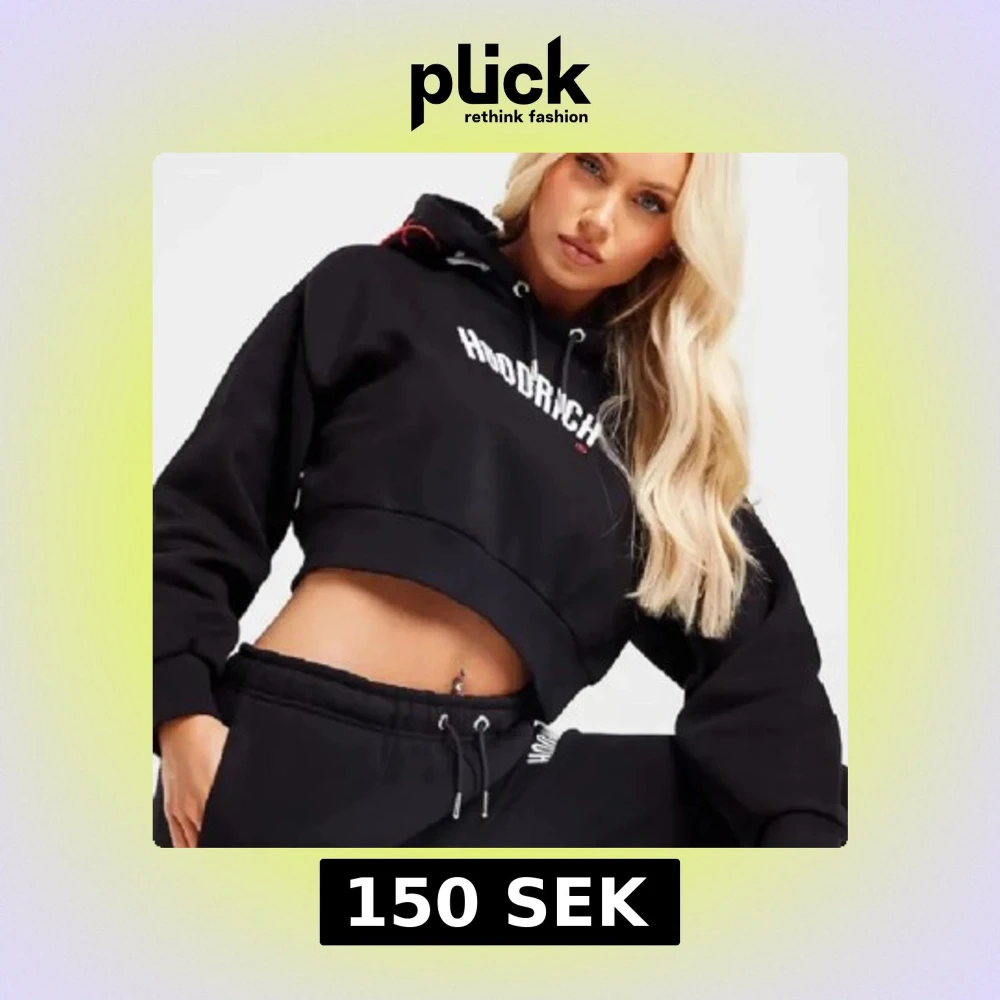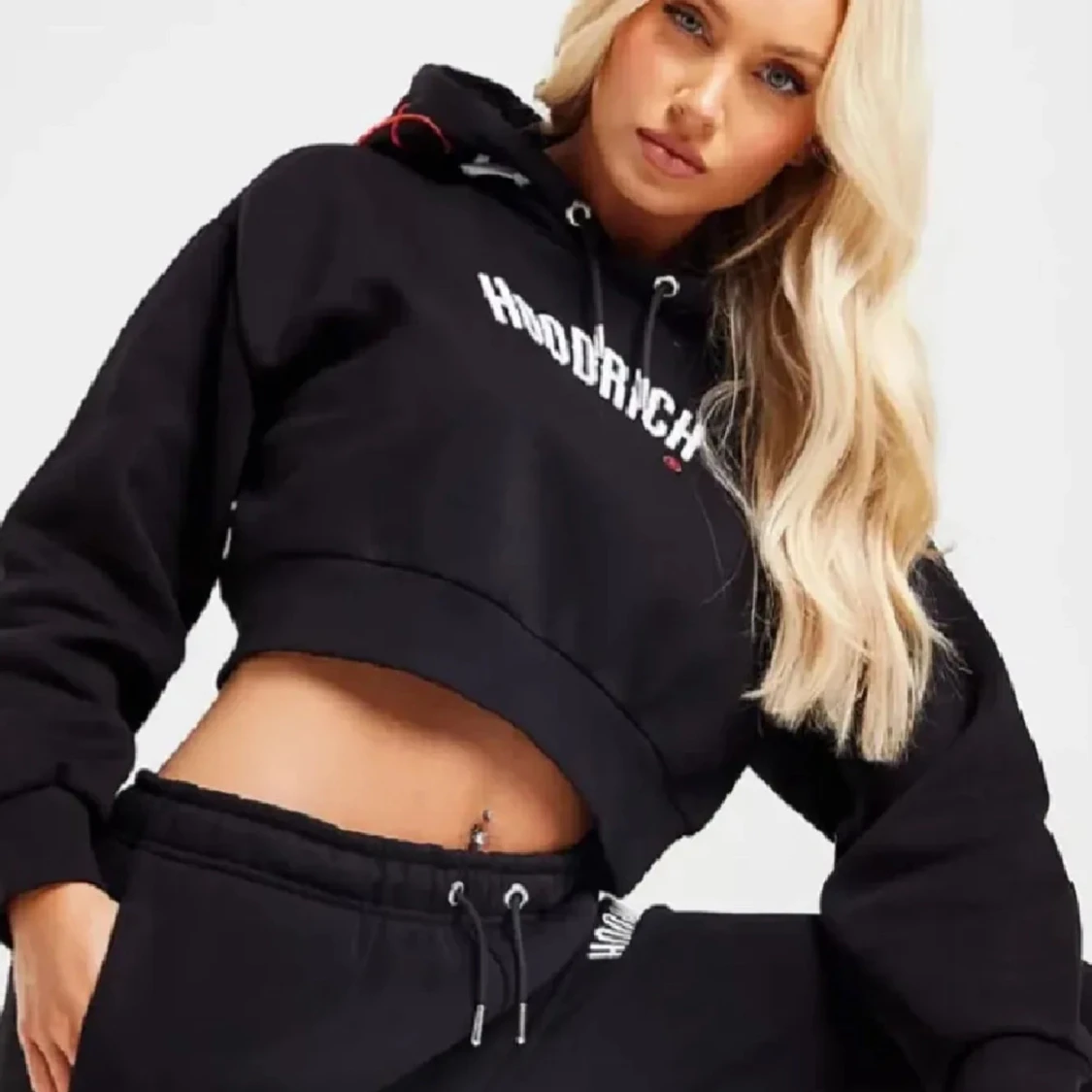 Säljer en svart croppad hoodie från Hoodrich med vit logga på bröstet. Tröjan har huva med dragsko och långa ärmar. Perfekt för en avslappnad och trendig stil.