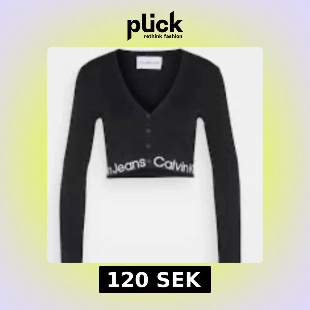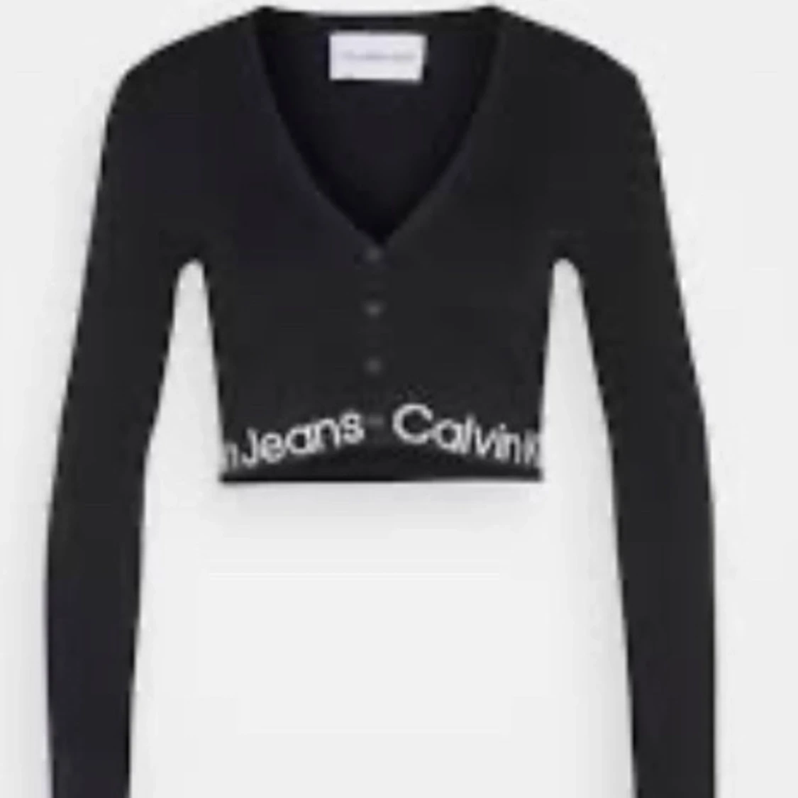 Snygg svart croppad kofta från Calvin Klein med v-ringning och knappar framtill. Den har långa ärmar och ett stilrent tryck med märkesnamnet längs kanten.