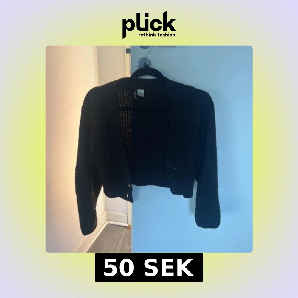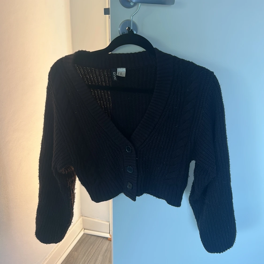 Svart stickad kofta från hm med croppad passform och bred ribbad kant. Tröjan har långärmade ärmar, v-ringning och tre svarta knappar framtill. Perfekt att slänga över en t-shirt för en chill look.