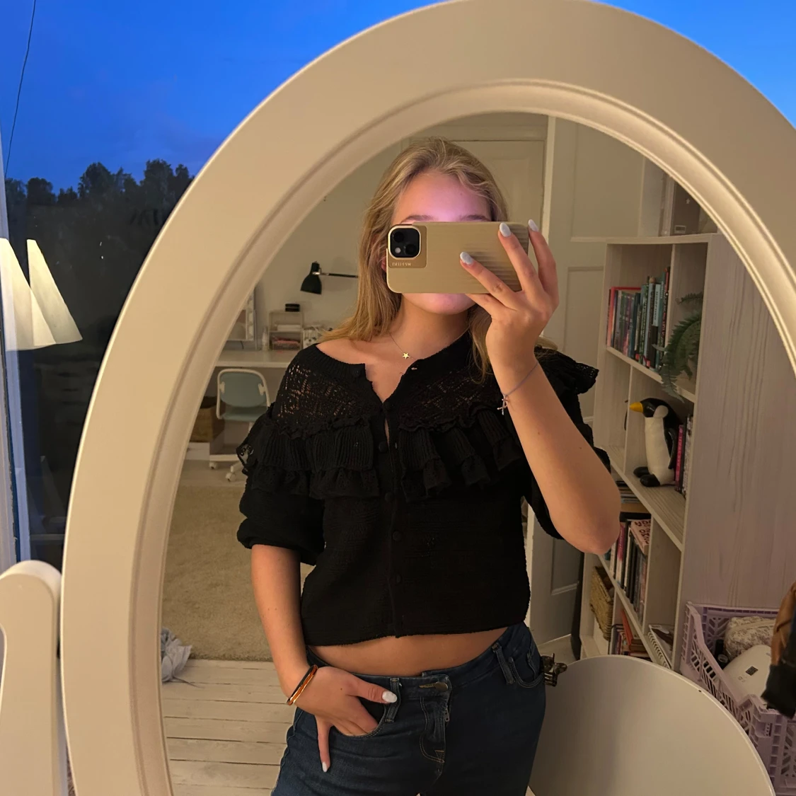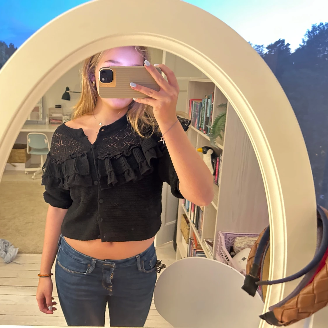 Svart kofta med croppad passform och snygga volangdetaljer. Perfekt till hösten och vintern och passar både till vardags och festligare tillfällen!💕💕🥰