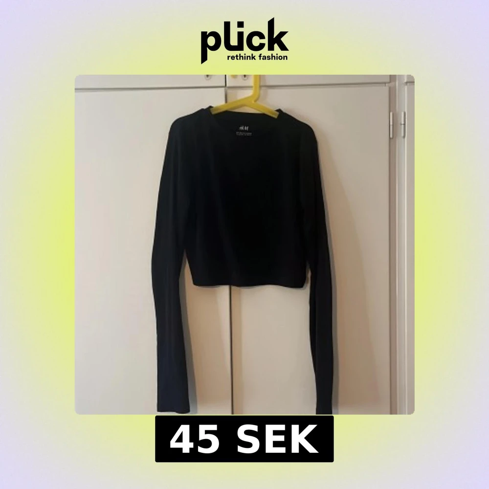 Säljer en svart croppad långärmad topp från H&M. Enkel och stilren design med rund halsringning och mjukt bomullsmaterial. Perfekt att matcha med höga jeans eller kjol. Snygg och basic för en trendig look.