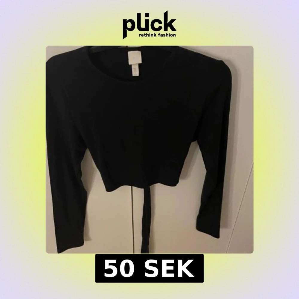 Svart långärmad topp från H&M med croppad passform och snygg knytning framtill i midjan. Enkel och stilren design med rund halsringning, perfekt att matcha med höga jeans eller kjol. Mjuk och skön bomullskvalitet.