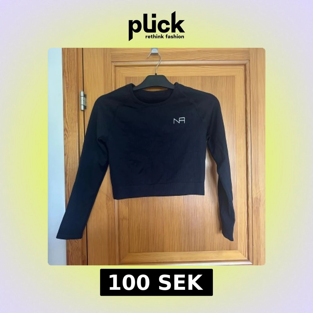 Säljer en svart croppad långärmad träningströja från NA med diskret logga på bröstet. Tröjan har tight passform och är perfekt för gymmet eller andra träningspass.