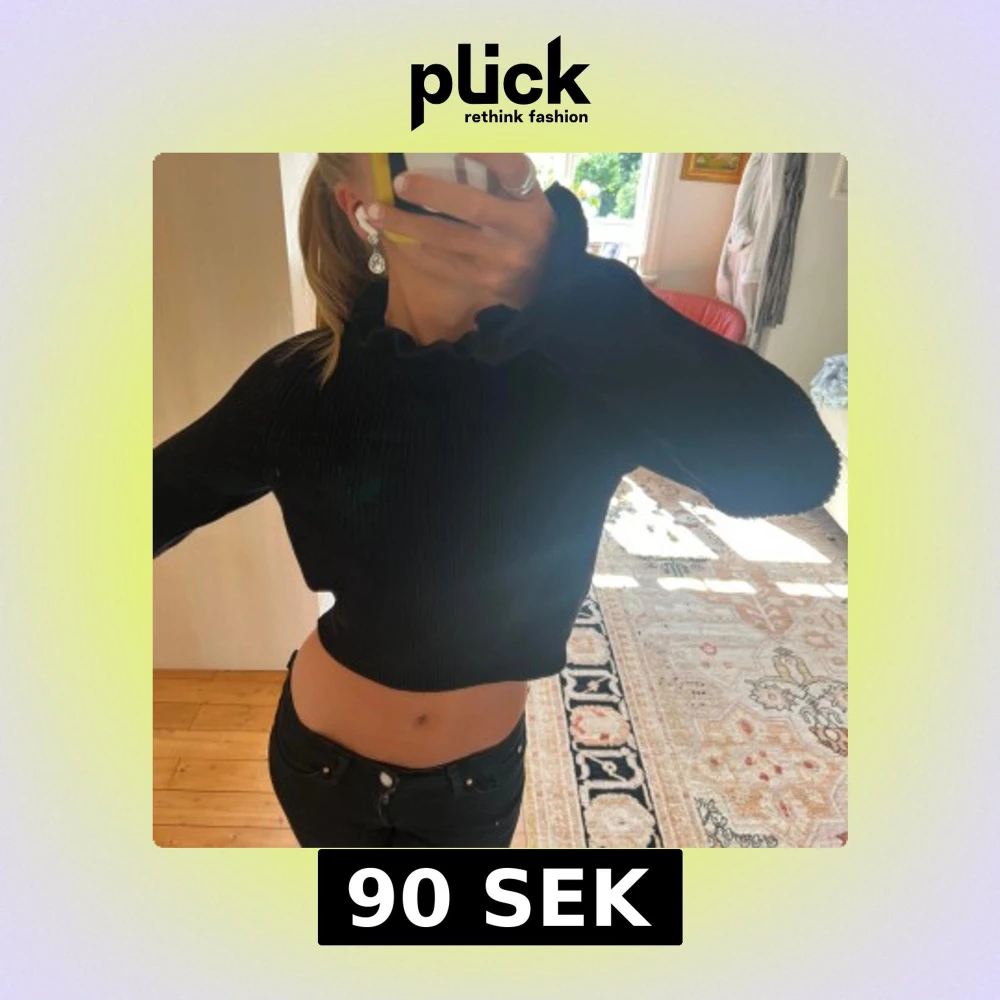 Svart croppad stickad tröja med lång ärm och volangdetalj vid halsringningen. Tröjan har en ribbad struktur och sitter snyggt med en loose passform.💛