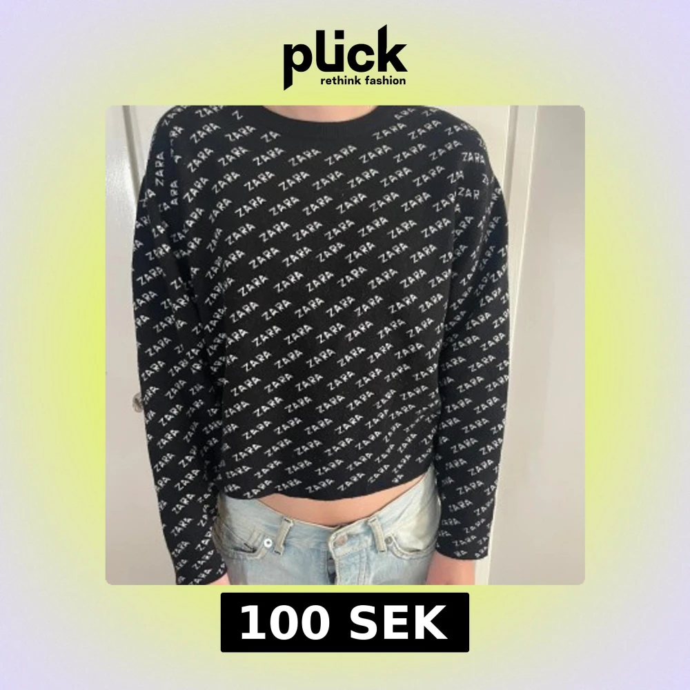 Svart croppad tröja från Zara med vit logotyp över hela plagget. Tröjan har lång ärm och rund halsringning, perfekt för dig som gillar streetstyle och vill sticka ut. Materialet är mjukt och skönt, passar till jeans eller kjol.