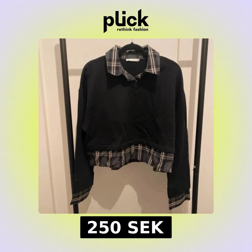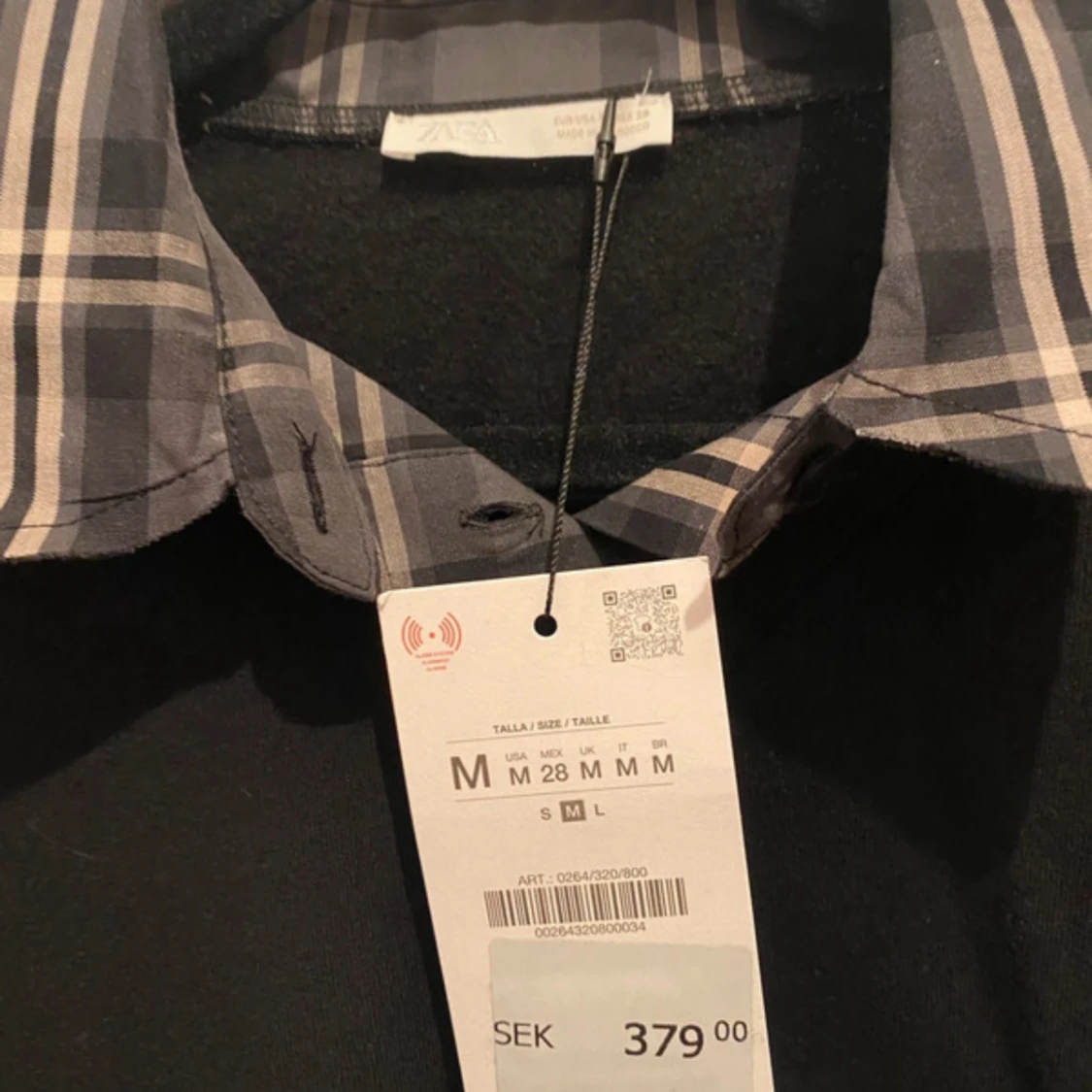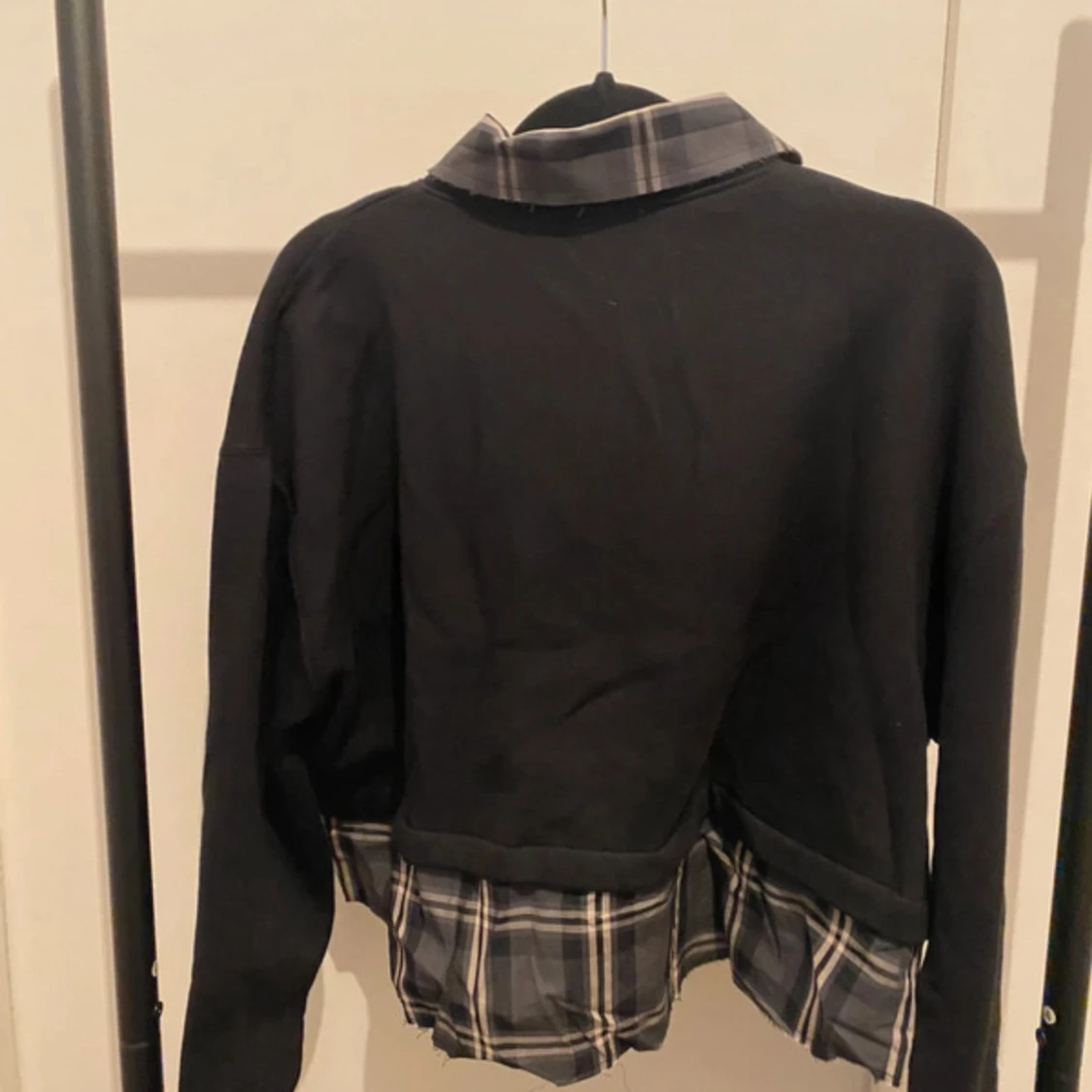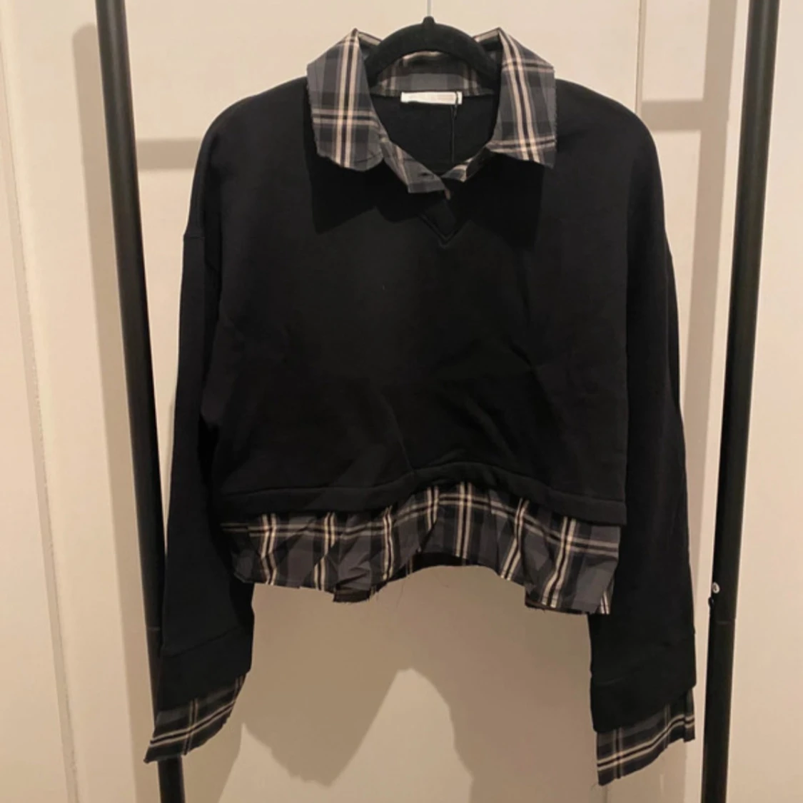 Svart croppad tröja från Zara med rutig skjortkrage och rutiga detaljer vid ärmslut och nederkant. Tröjan har lång ärm och en loose passform, perfekt för dig som gillar lager-på-lager-looken. Snygg kontrast mellan det svarta och de grå rutorna.