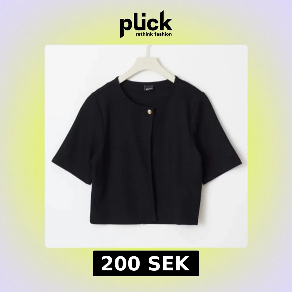 Stilren svart croppad väst från Gina tricot med korta ärmar och rund hals. Västen har en enkel design med en guldfärgad knapp framtill. Perfekt för att lyfta din outfit med en minimalistisk touch.