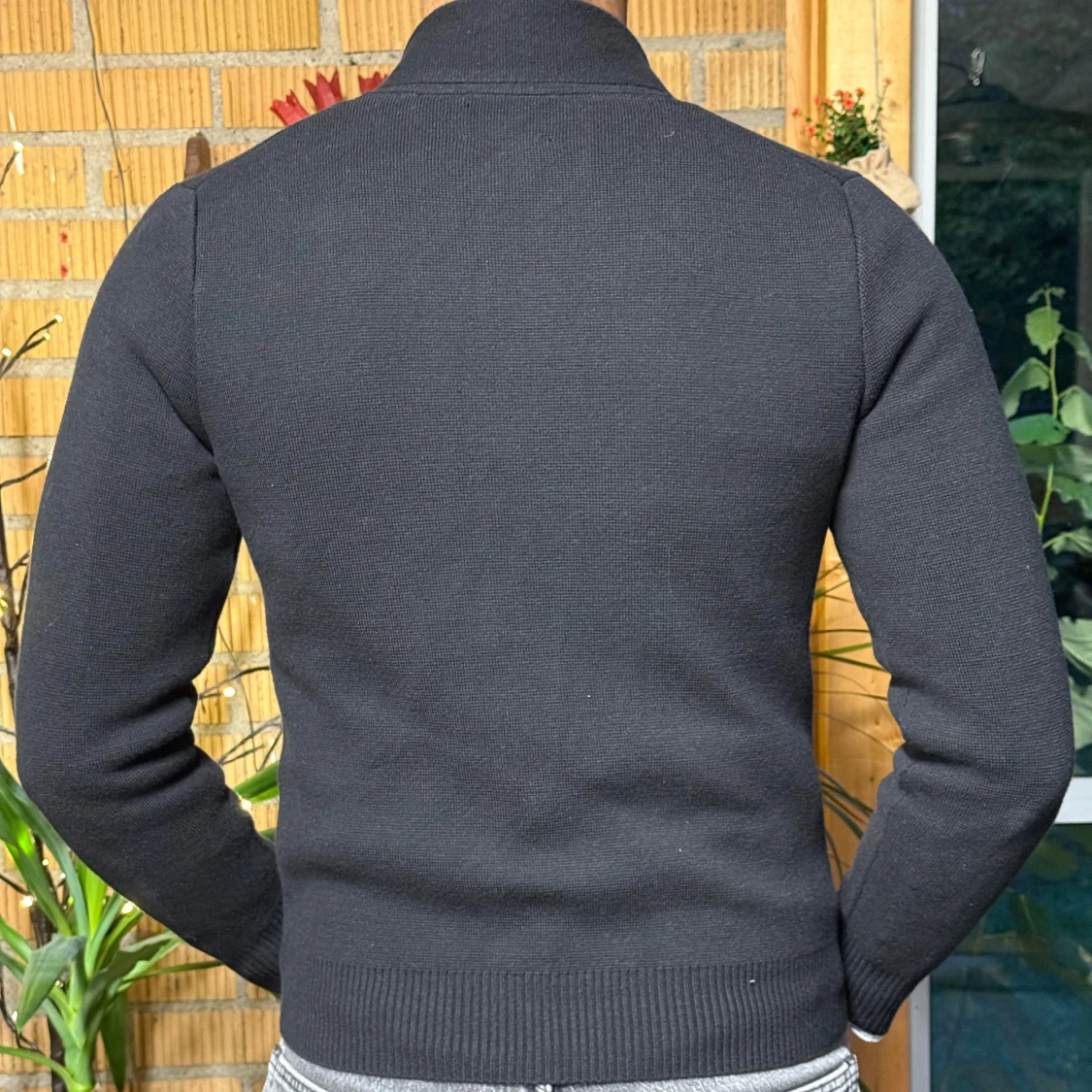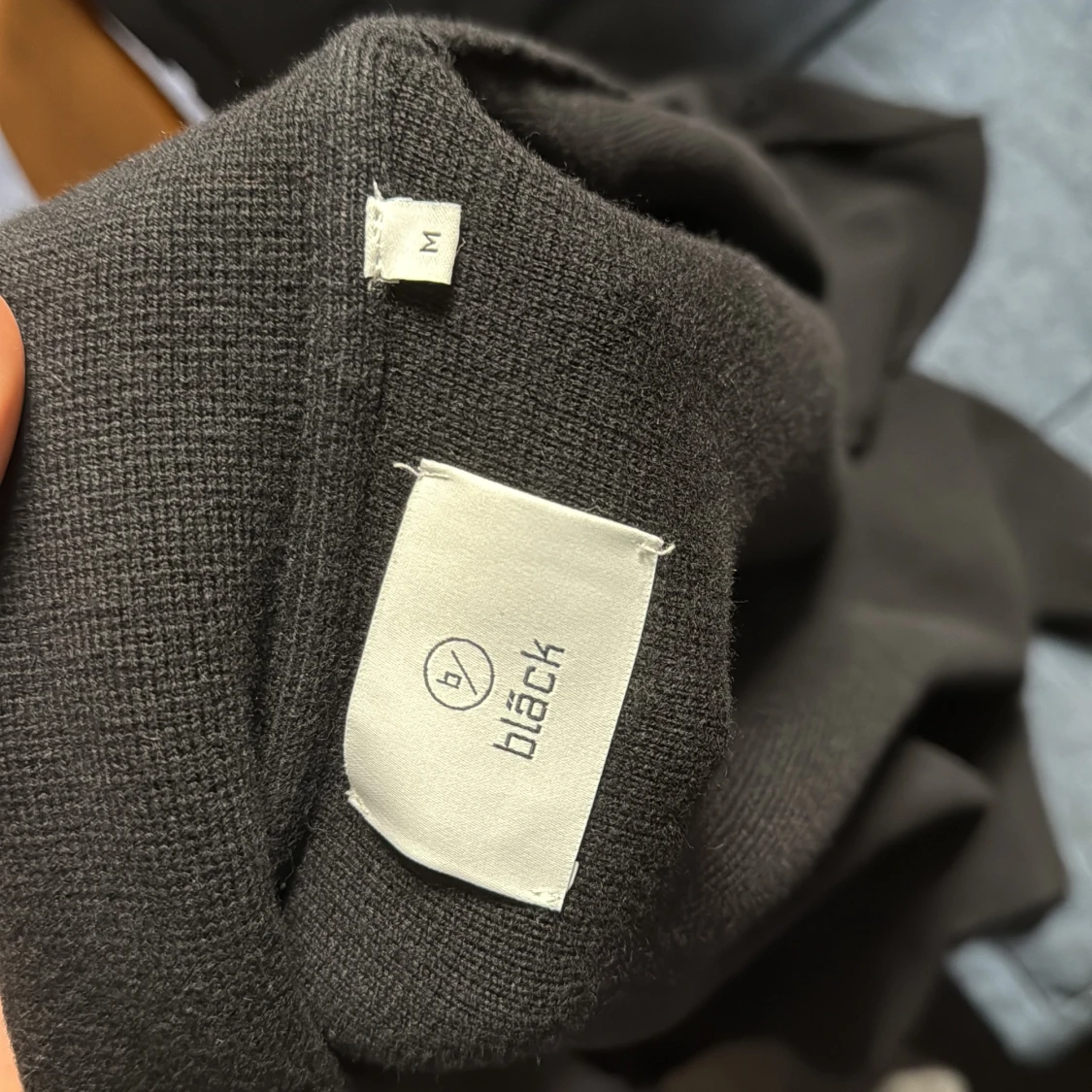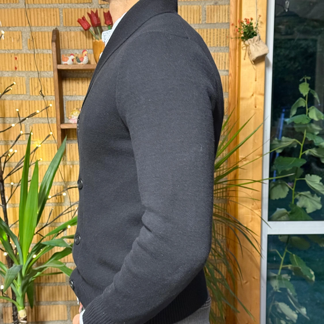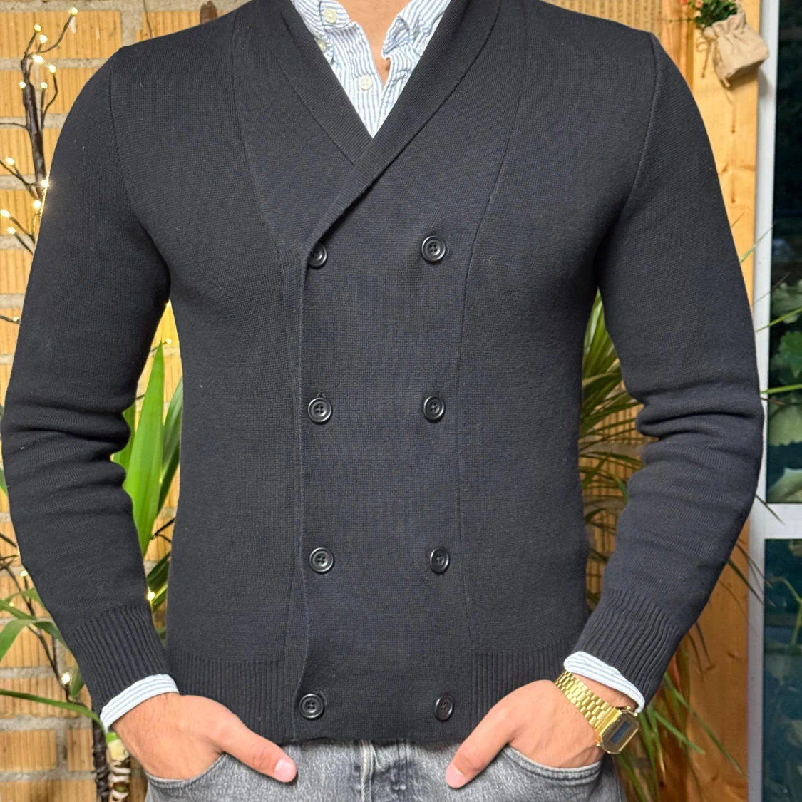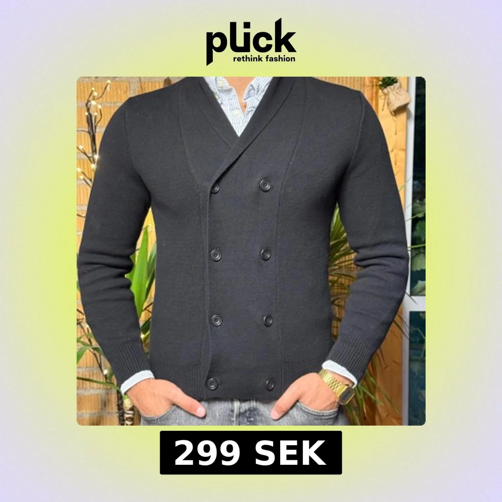 Stilren svart kofta från Bläck i storlek M. Koftan är dubbelknäppt med sex knappar framtill, har lång ärm och ribbade muddar. Snyggt skräddad passform och mjukt stickat material som passar perfekt till skjorta eller t-shirt.
