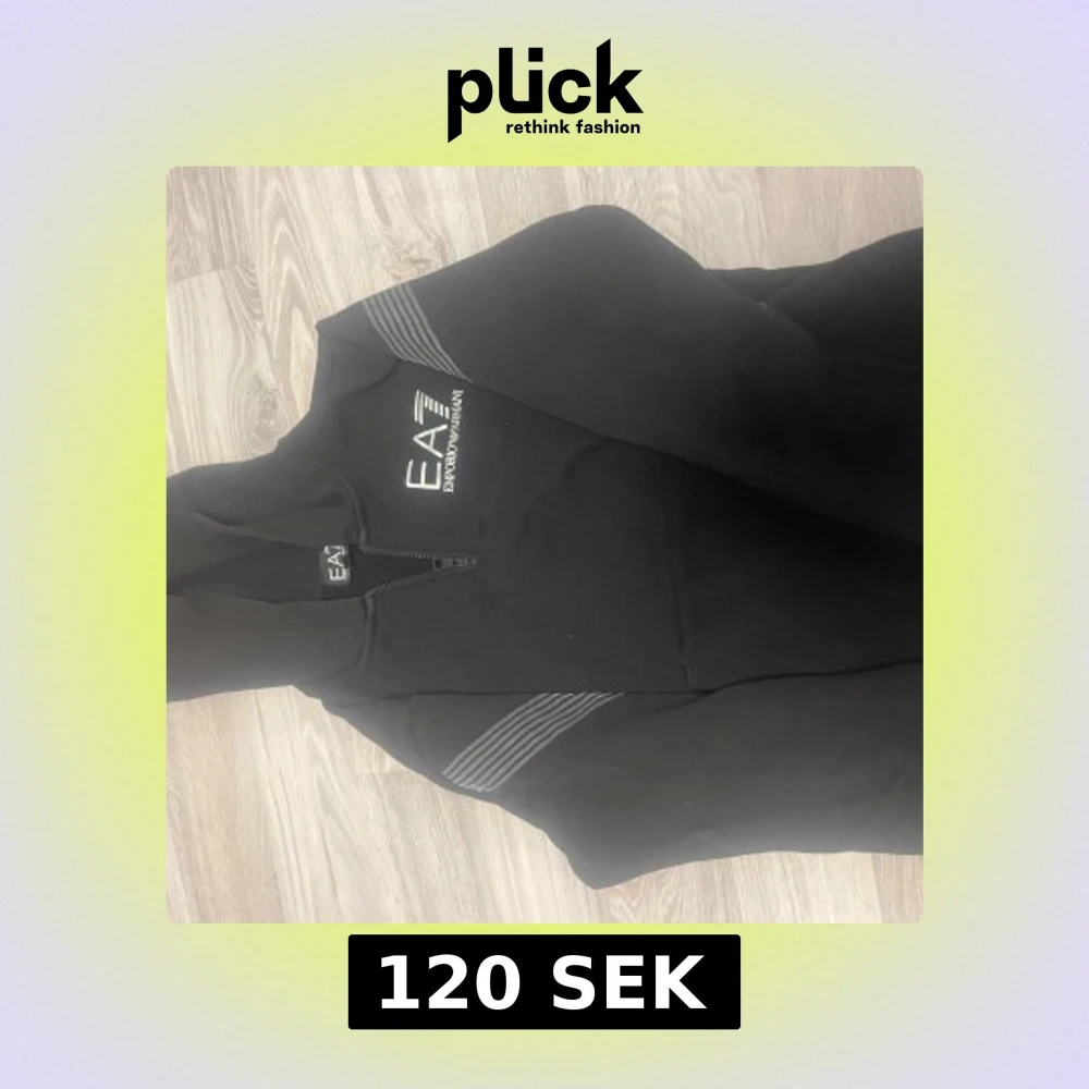 Svart hoodie från EA7 Emporio Armani med halv dragkedja och huva. Snygga gråa ränder på axlarna och stort EA7-tryck på bröstet. Perfekt för dig som gillar stilrena och sportiga plagg med premiumkänsla.