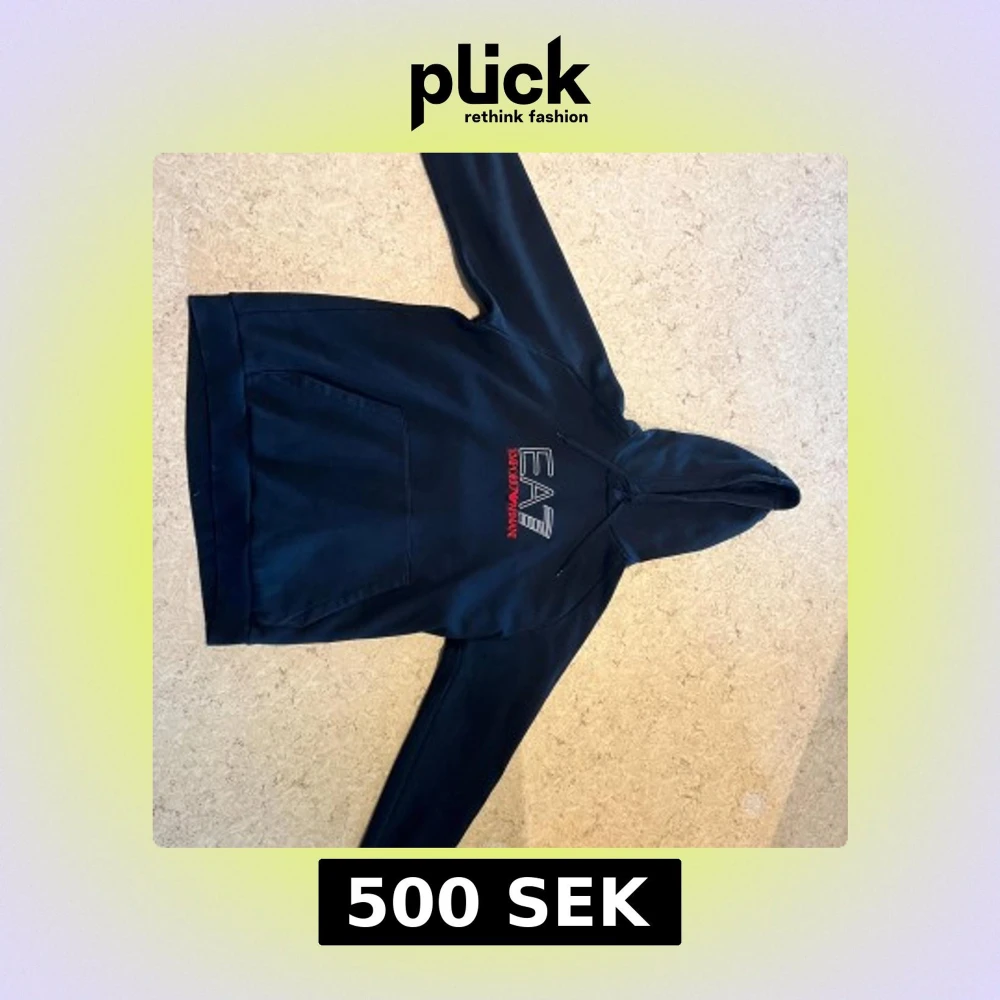 Snygg mörkblå hoodie från EA7 Emporio Armani med stor vit och röd logga på bröstet. Tröjan har huva med snörning och en klassisk magficka. Perfekt för dig som gillar stilrena streetwear-plagg med premiumkänsla.
