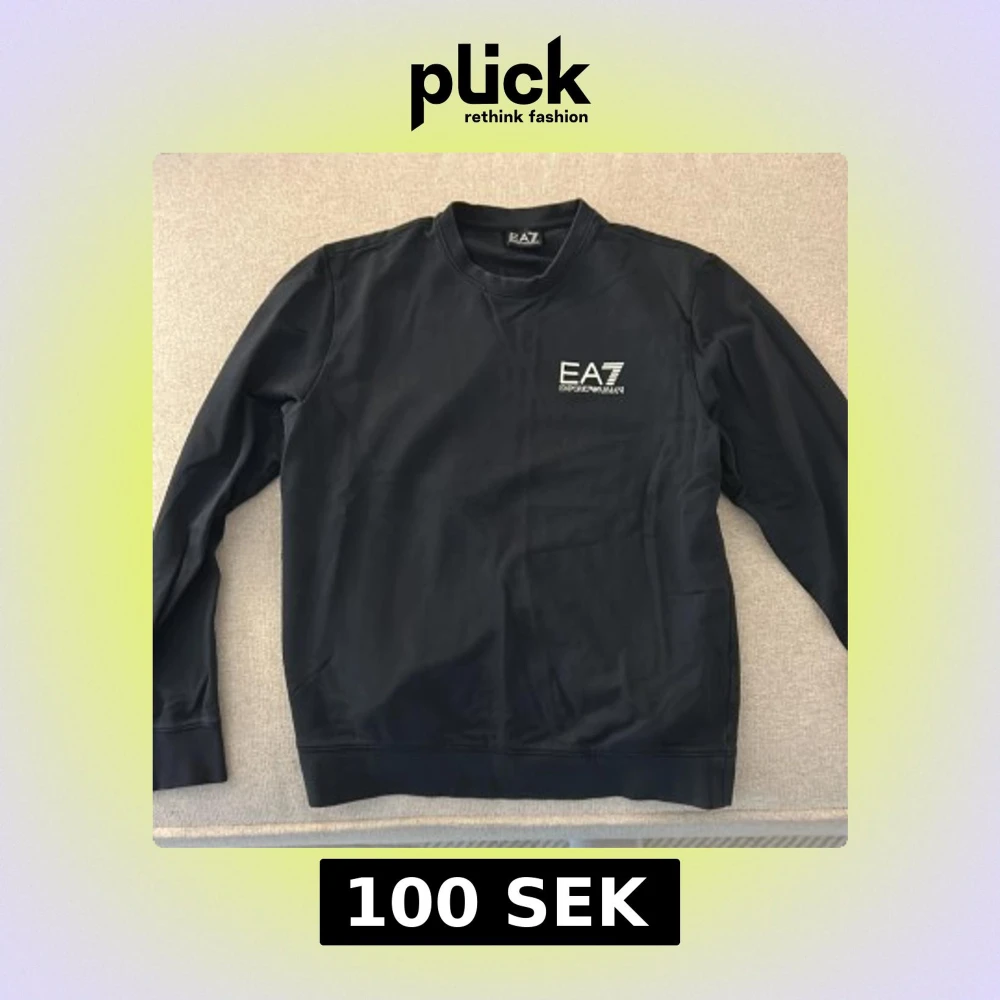 Svart långärmad sweatshirt från EA7 Emporio Armani med vit logotyp på bröstet och diskreta ränder i nacken på baksidan. Tröjan har rund hals och är tillverkad i mjuk bomull med en clean och stilren look. Perfekt för dig som gillar sportig och modern stil.