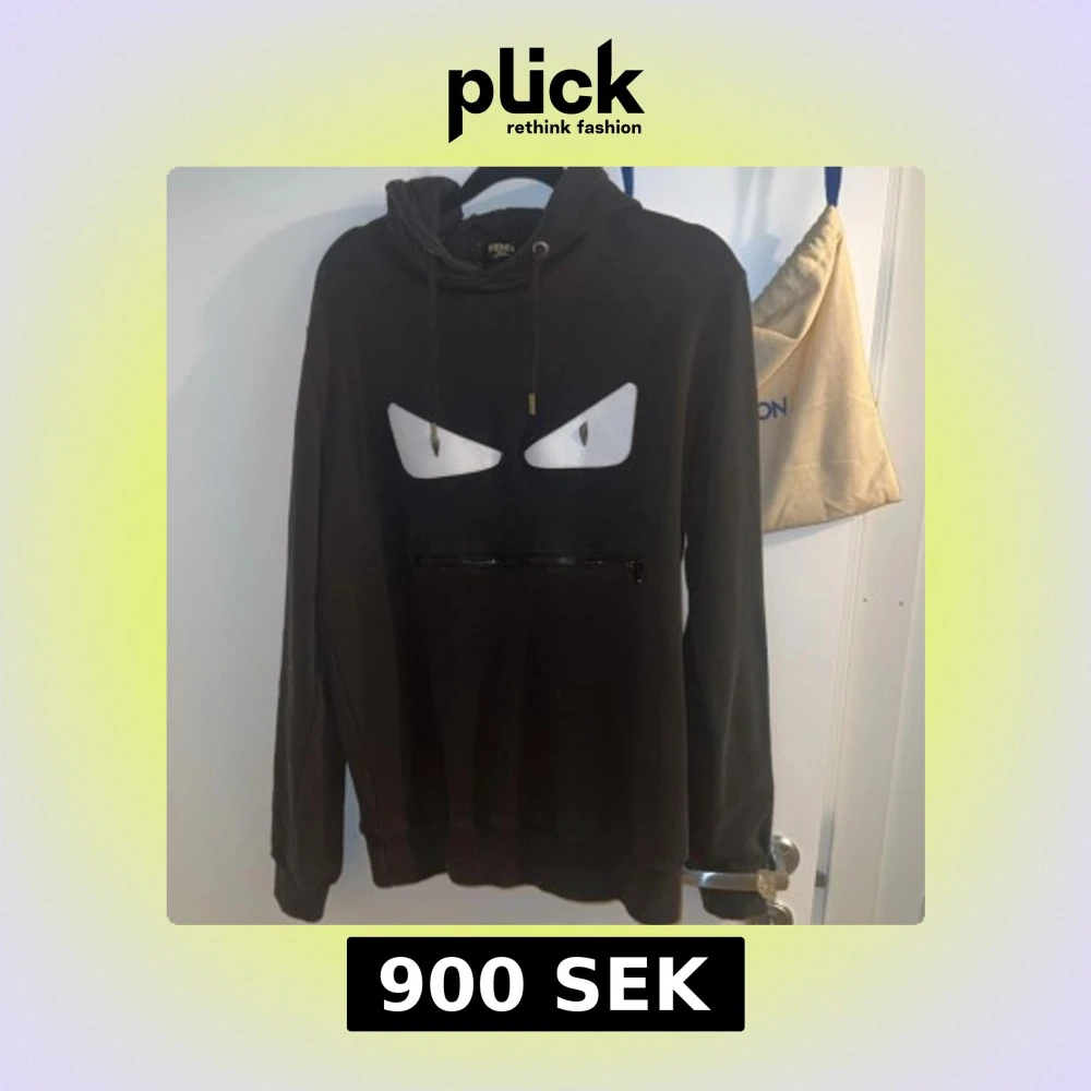 Svart hoodie från Fendi med ikoniskt ögonmotiv framtill och dragkedjedetalj under ögonen. Tröjan har huva med snörning och långa ärmar. Perfekt för dig som vill sticka ut med en cool och exklusiv streetstyle. Bra skick M men passar även S