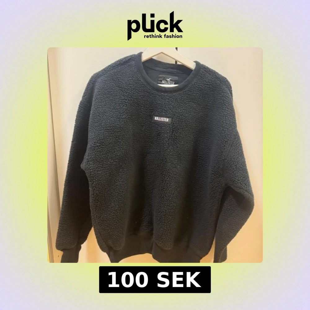 Mysig svart fleece-tröja från Hollister med broderad logga på bröstet. Tröjan har rund halsringning, ribbade muddar och är perfekt för kyliga dagar. Oversized passform för en avslappnad stil.