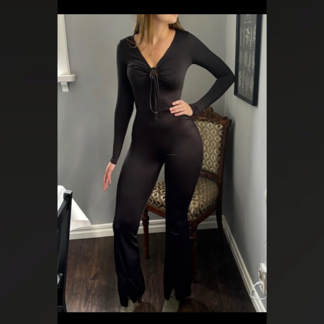 Säljer en svart långärmad body suit med v-ringning och snygg snörning framtill. Toppen är tight och figurnära med stretchigt material som ger en smickrande passform. Perfekt för dig som gillar en stilren och trendig look.