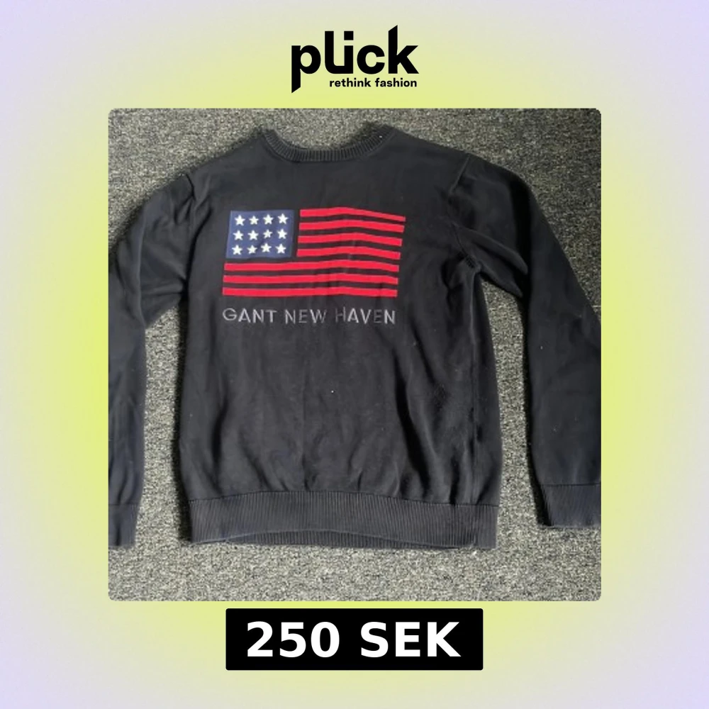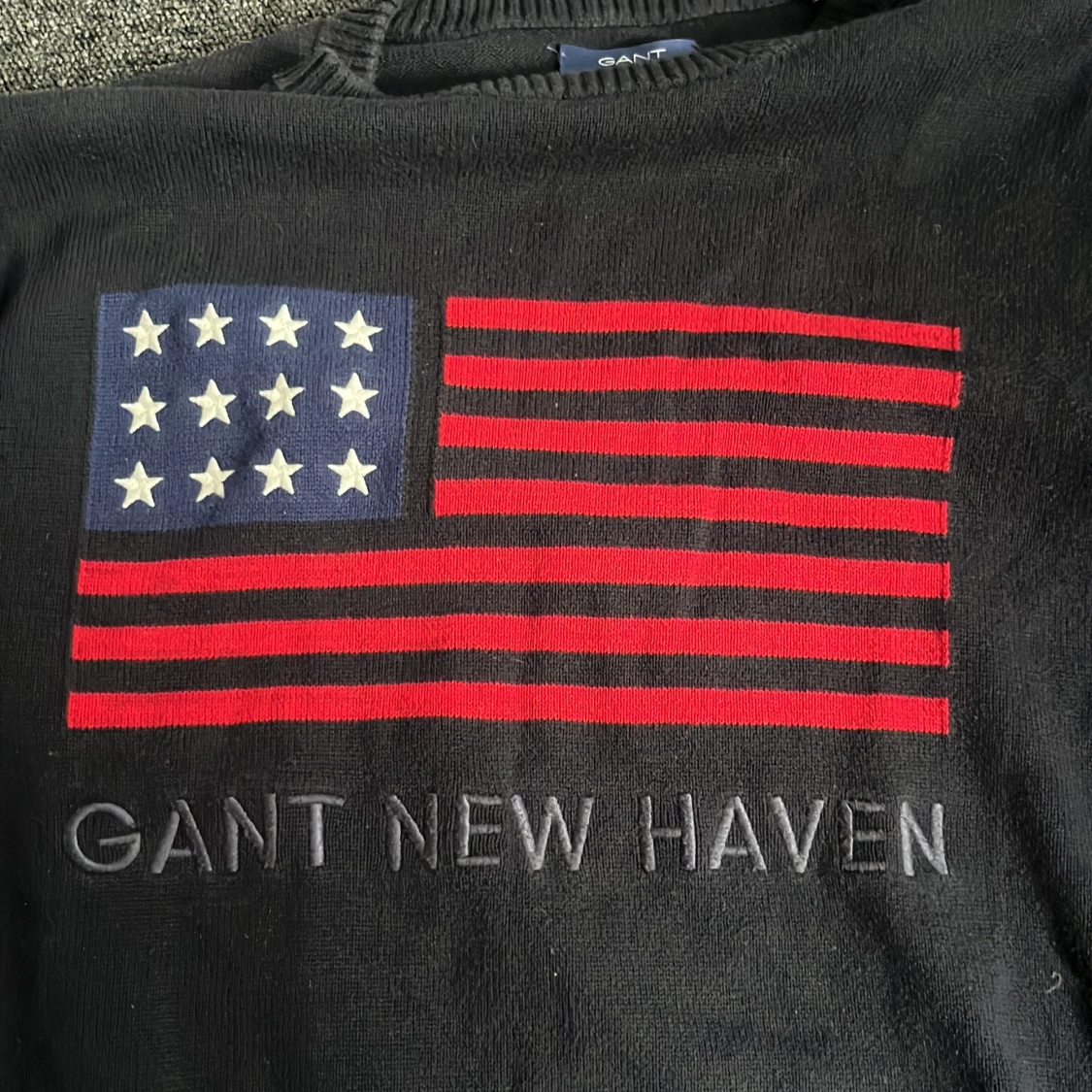 Snygg svart tröja från GANT med ett stort flaggmotiv i rött, vitt och blått på ryggen. Texten 'GANT NEW HAVEN' är tryckt under flaggan. Perfekt för en stilren och avslappnad look.