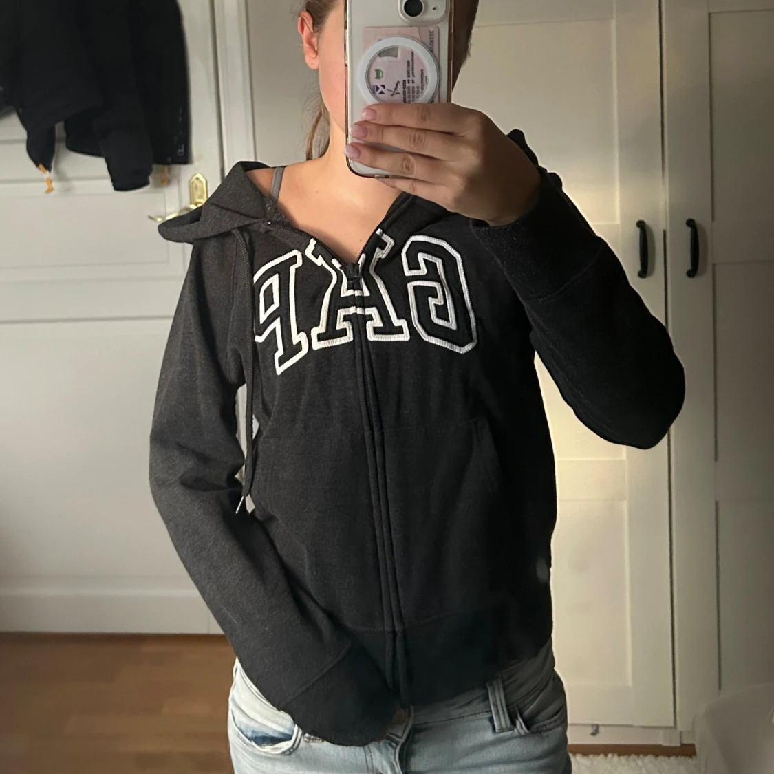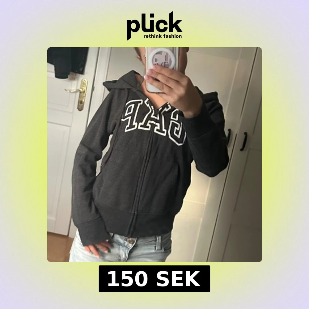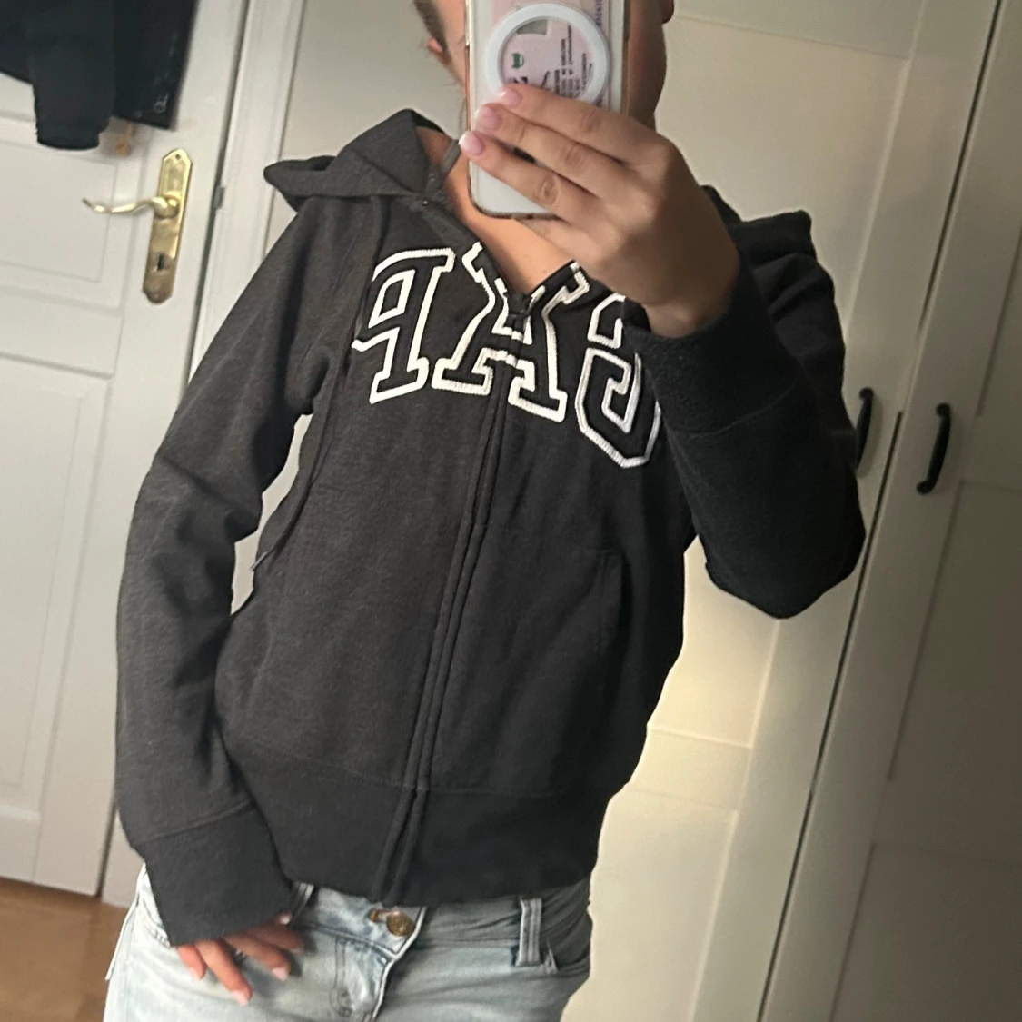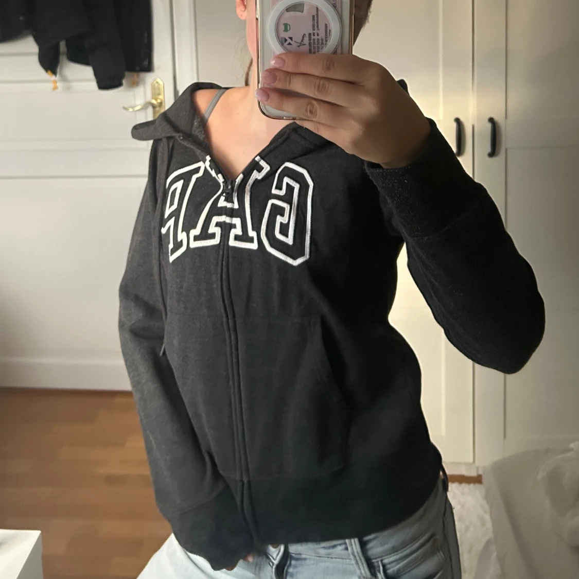 Mysig svart hoodie från GAP med vit broderad logga över bröstet. Tröjan har huva, dragkedja framtill och fickor på sidorna. Perfekt för chill dagar eller när du vill ha en enkel och snygg look.