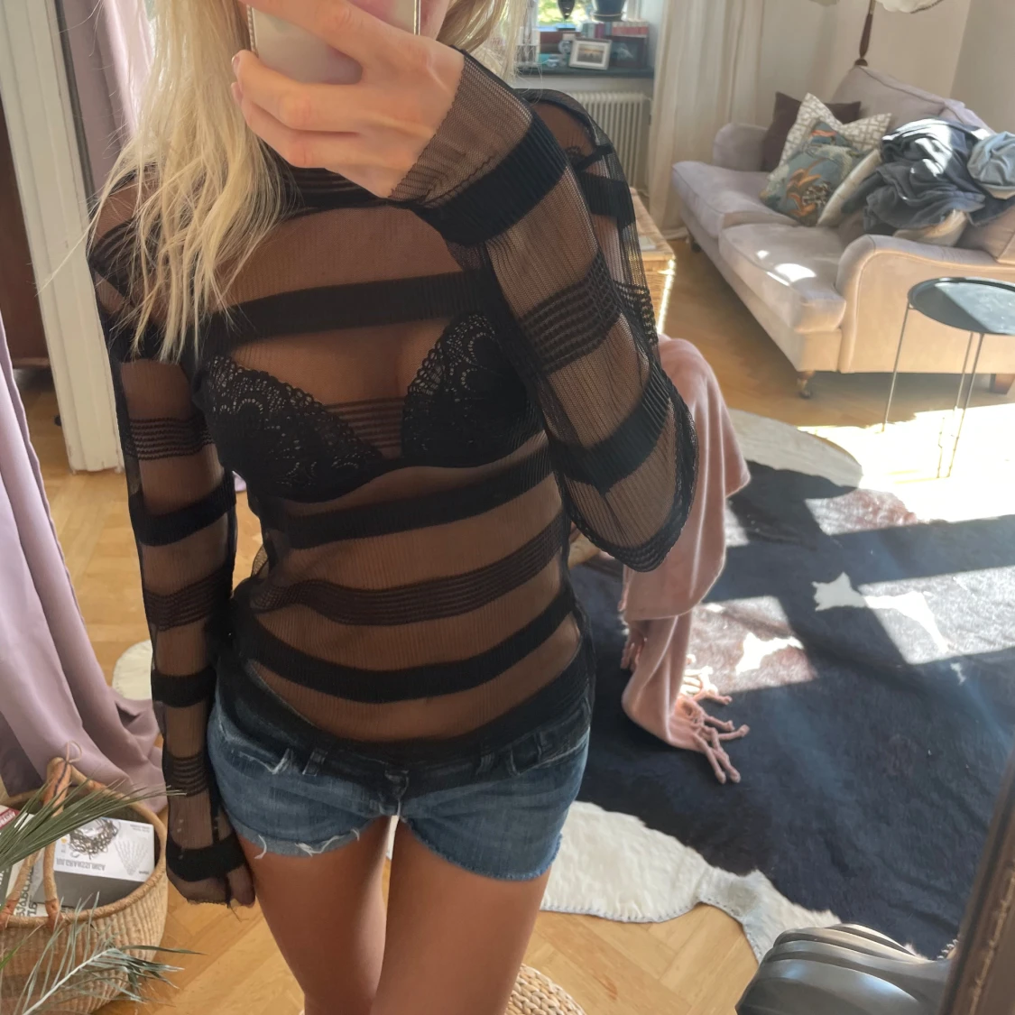Säljer en svart genomskinlig långärmad mesh tröja. Jättefina detaljer och inte alls varm. Storlek L från Mexx🖤🖤