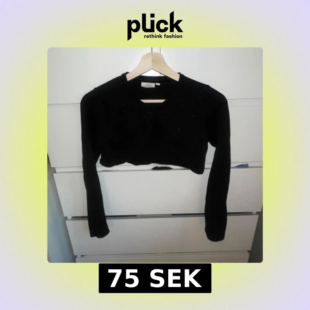 Säljer en svart glittrig kofta från KappAhl i storlek 146/152. Koftan är croppad med lång ärm och har ett diskret glittrigt tyg som ger en snygg touch. Perfekt att slänga över en topp för en extra cool look.