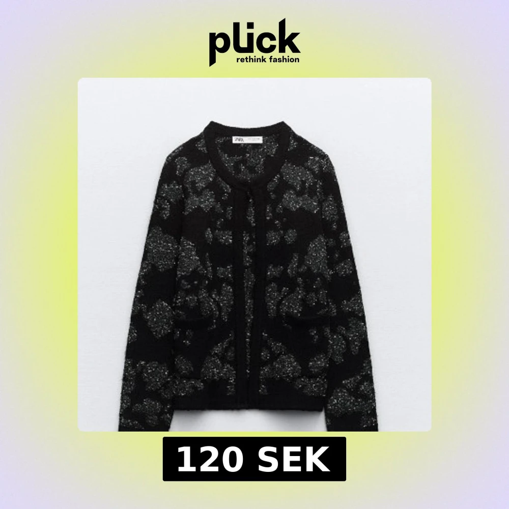 Snygg svart kofta från Zara med glittriga paljettdetaljer och två små fickor framtill. Koftan har lång ärm och är stickad. Endast använd ca 4 gånger.