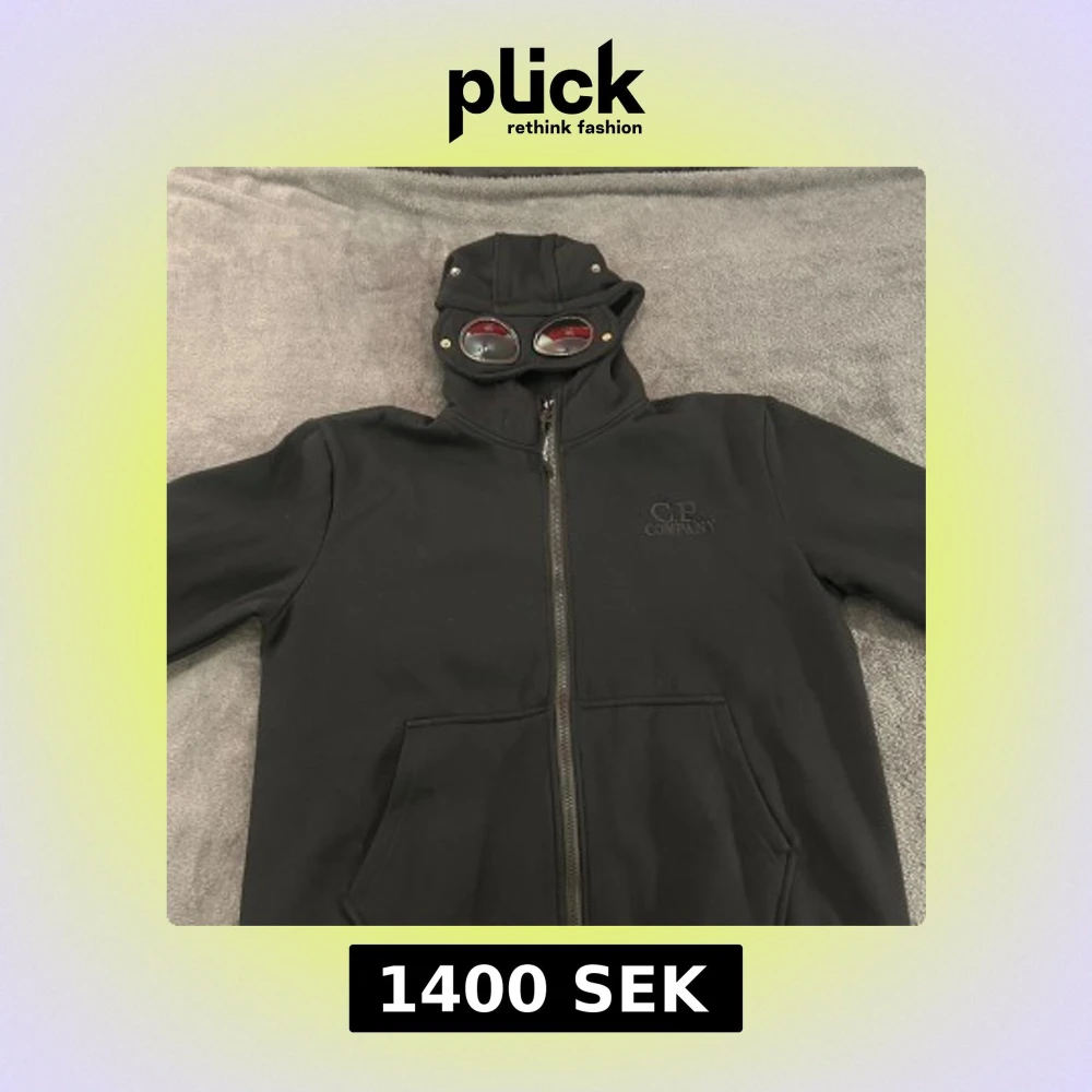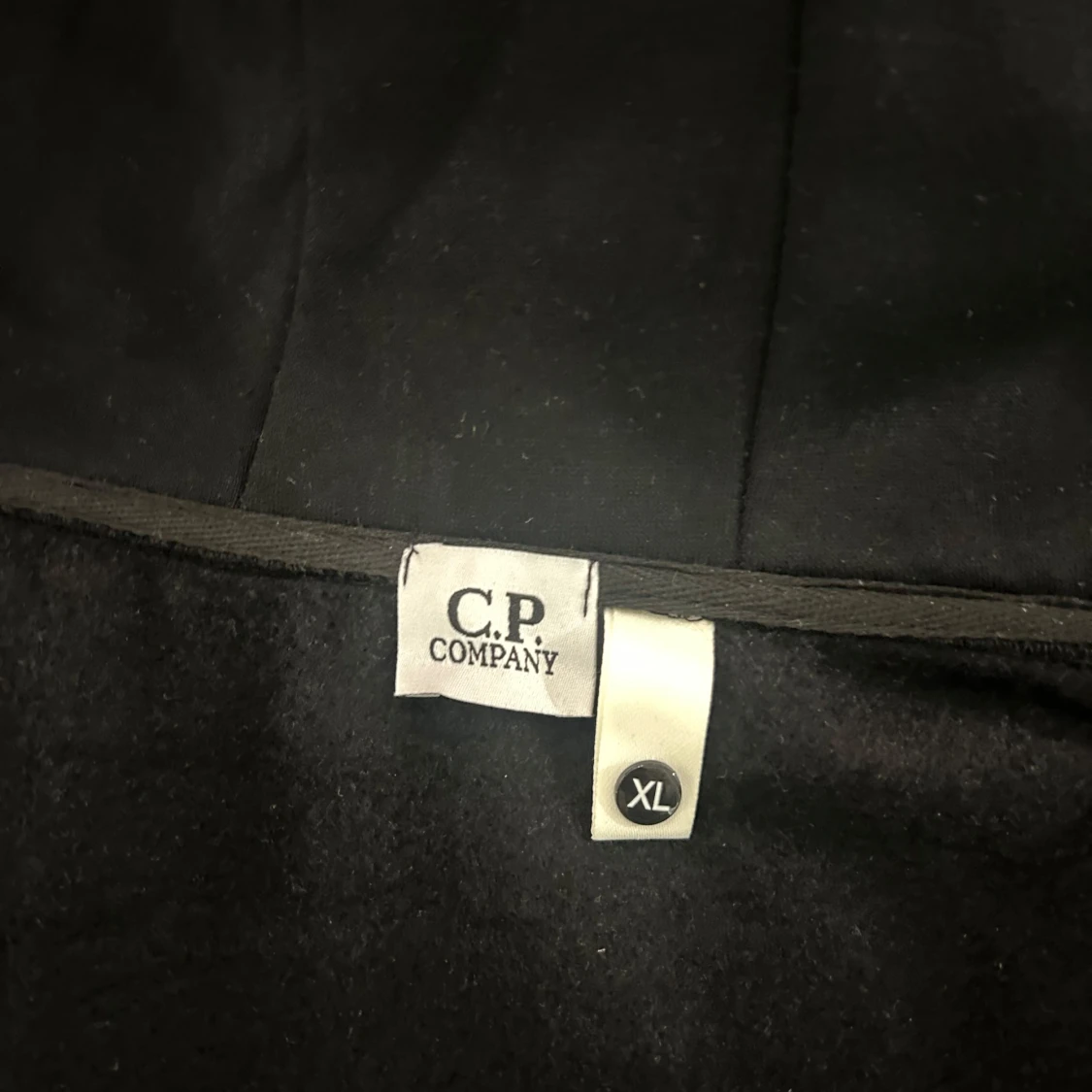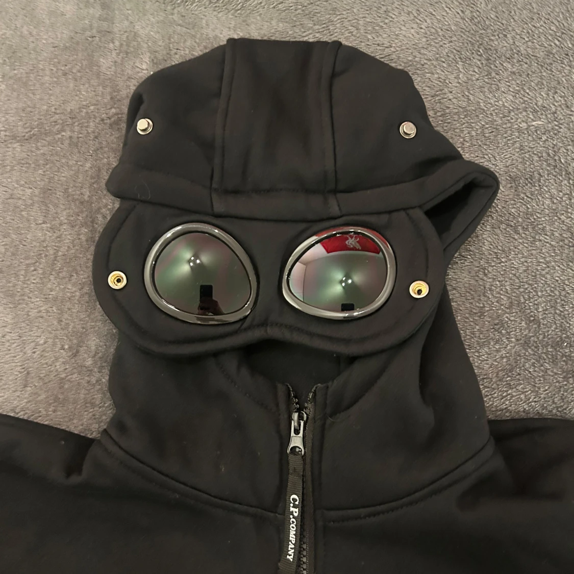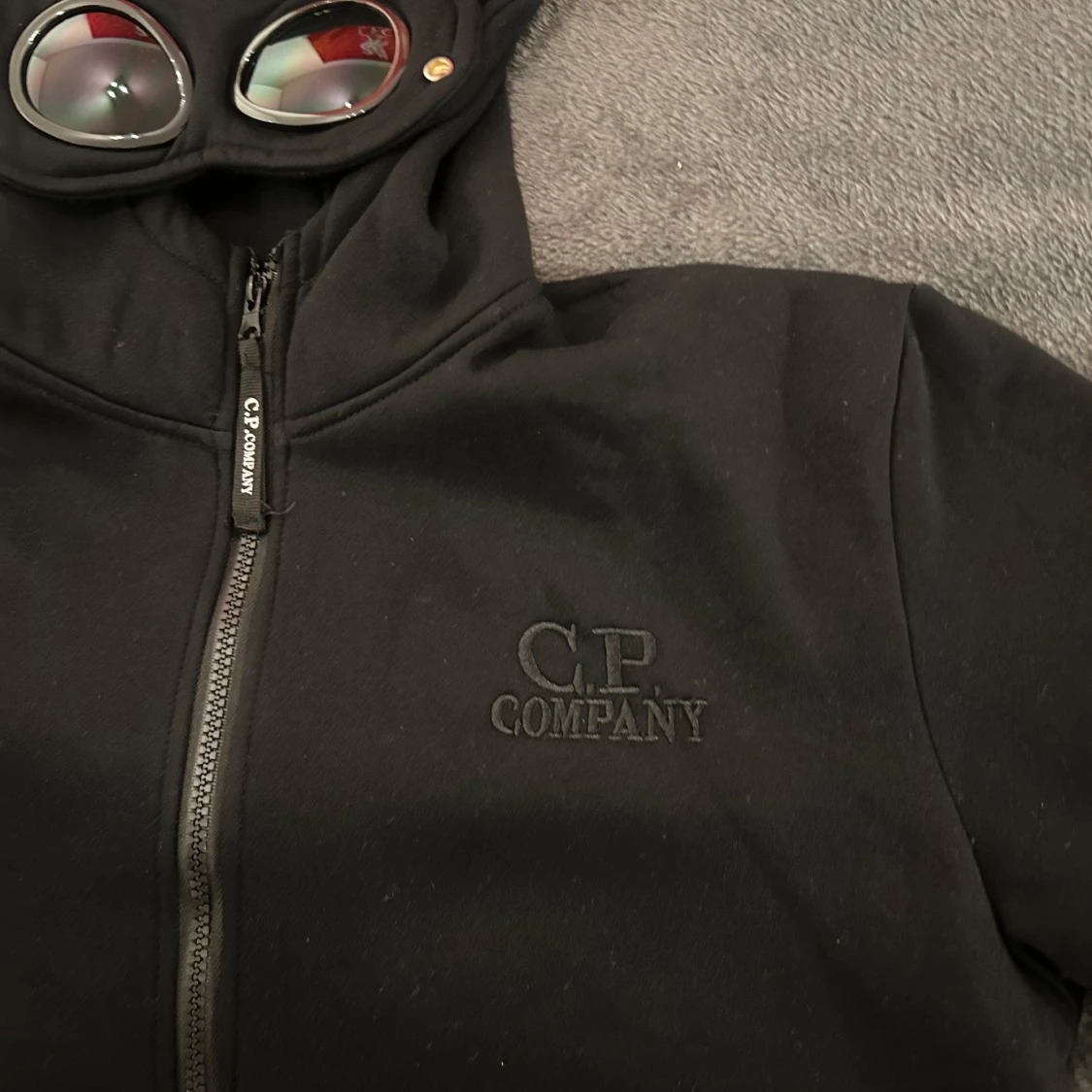 Svart jacka från C.P. Company med ikoniska goggle-detaljer i huvan. Jackan har dragkedja framtill, två fickor och broderad logga på bröstet. Tillverkad i mjukt material och har en clean, modern look som sticker ut.