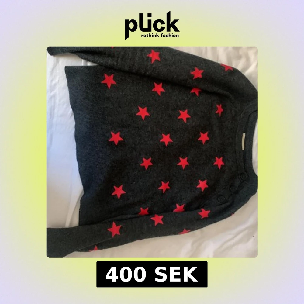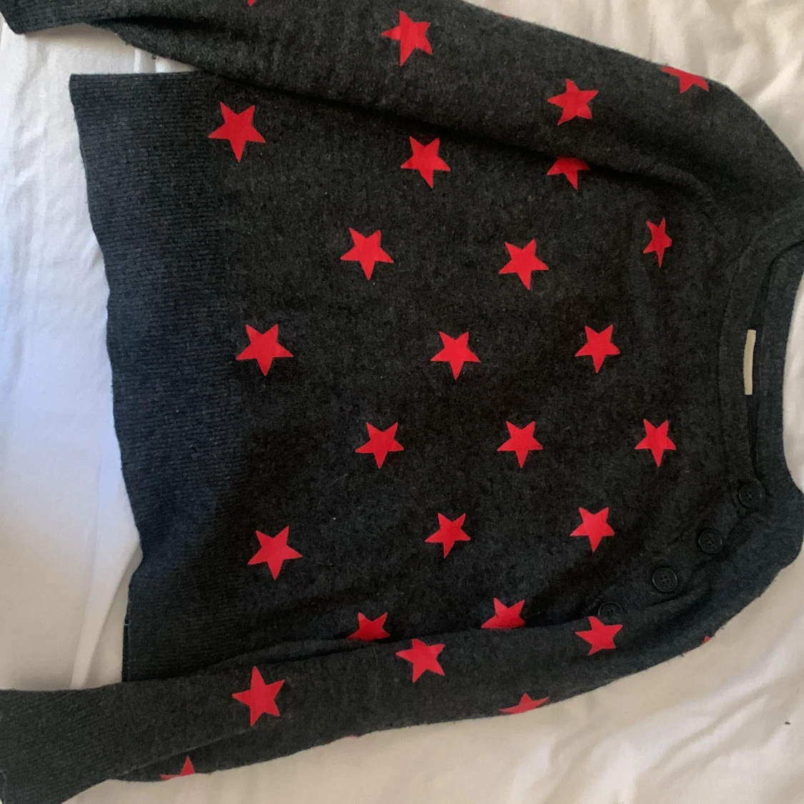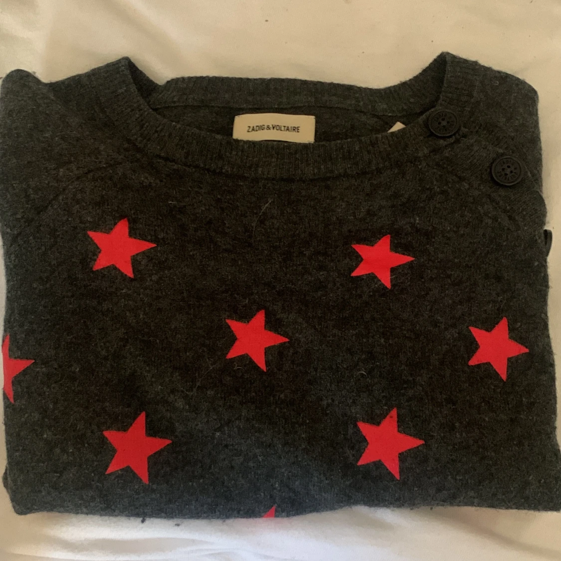 Snygg svart/grå kashmir tröja från Zadig & Voltaire med röda stjärnor över hela. Tröjan har långa ärmar och knappar vid axeln för en cool detalj. Använd fåtal gånger. Pris kan diskuteras